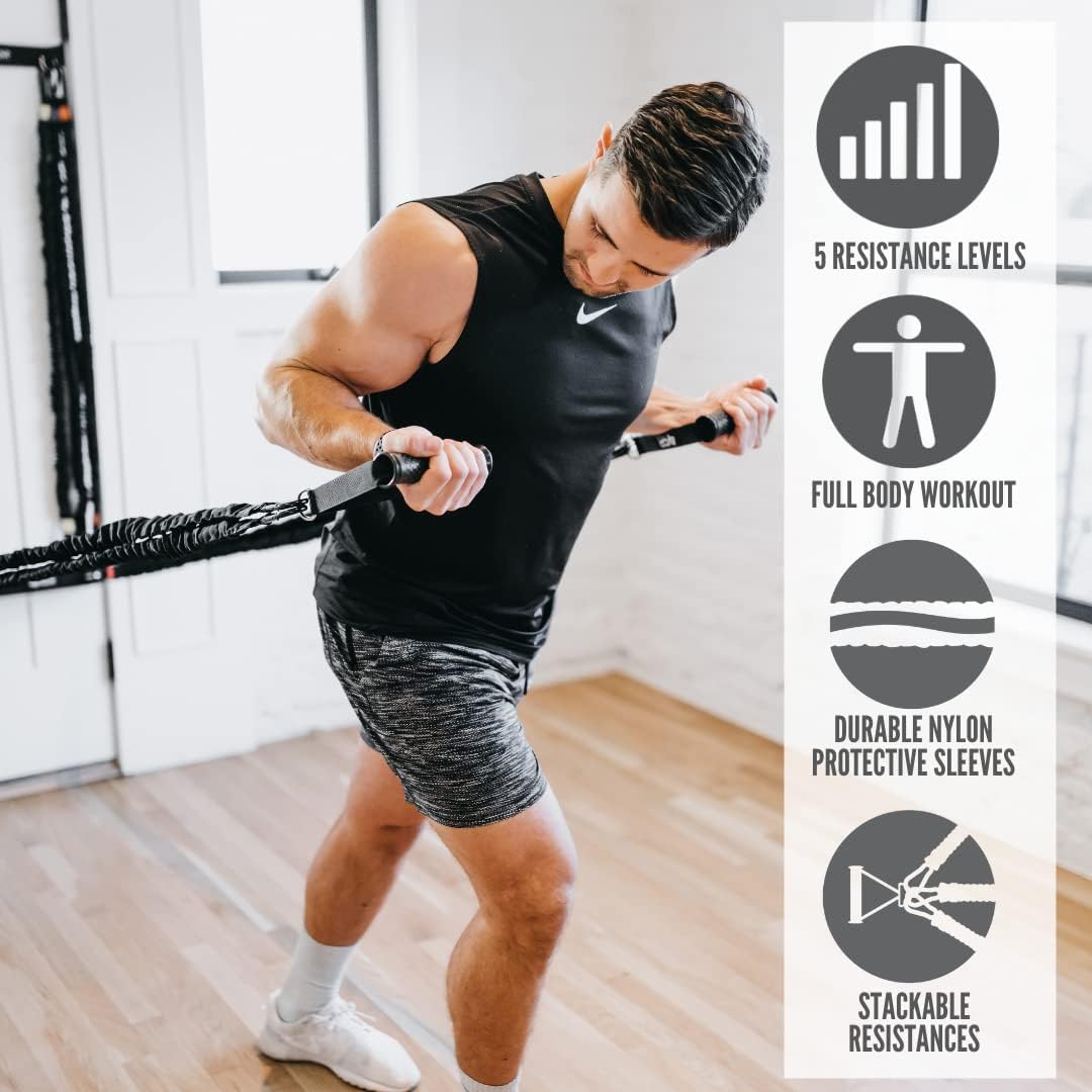 4KOR Deluxe Shoulder and Full Body Cross Anchored Resistance Cord System with Interchangeable Handles, Foot Straps, and Workout Guide. Exercise Bands with Nylon Sleeves, Anchors, and Carry Bag
