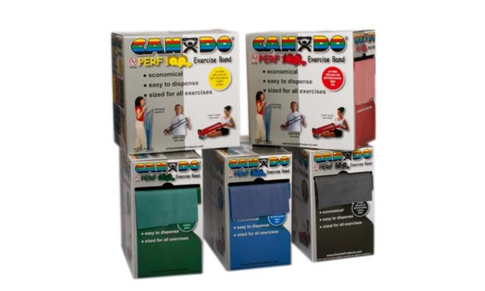 CanDo Per 100 latex free economic bulk size roll is the best value for large clinics. The Per 100 economic bulk size roll is the best value for large clinics and centers. The CanDo Per 100offers a true 100 yard roll of exercise band in a convenient dispenser box. The band is perforated every 5 feet. There are 60 5-foot exercisers in each roll. To prepare exercise band for use simply pull 5 foot length from dispenser box and separate perforation line by hand. No scissors are needed!. CanDo high quality latex free synthetic exercise band has been used for physical therapy and athletic training by clinics, fitness centers and individuals since 1987. It has become a well known staple of many physical therapy programs. The latex free formula has been specially created to mimic the stretch characteristics of latex band. CanDo exercise band is an economic solution for upper and lower body exercise. Lightweight, compact and portable. Durable. Effective when used alone, or with handles and anchors. Color-coded according to the exercise band’s resistance. CanDo is licensed to use the Thera-Band color sequence so resistance level is easily identified. Available in 8 levels of resistance for progressive exercise. Levels range in order of strength from least to greatest resistance: tan, yellow, red, green, blue, black, silver, gold. Uniform width – each band is 5″ wide.