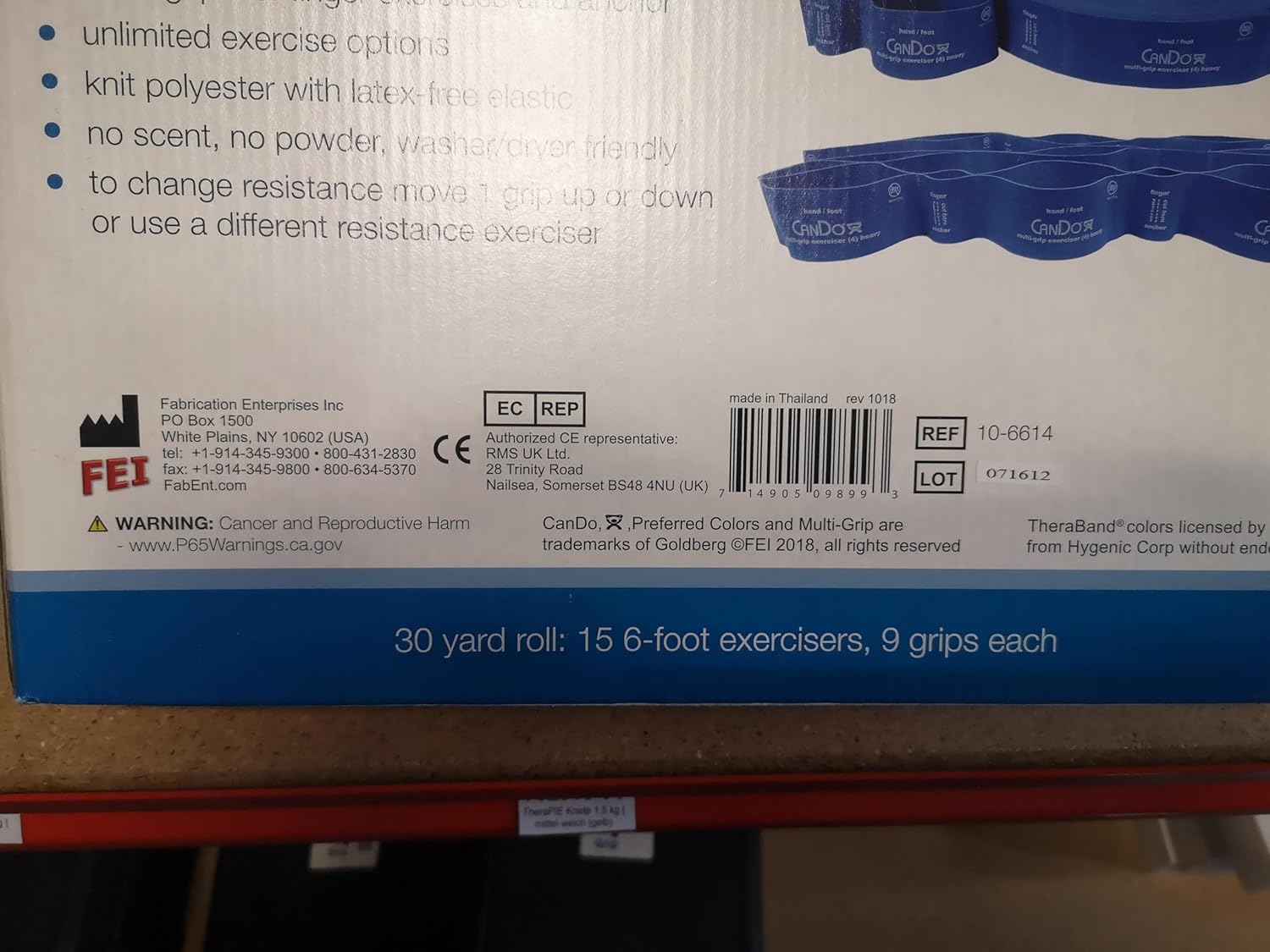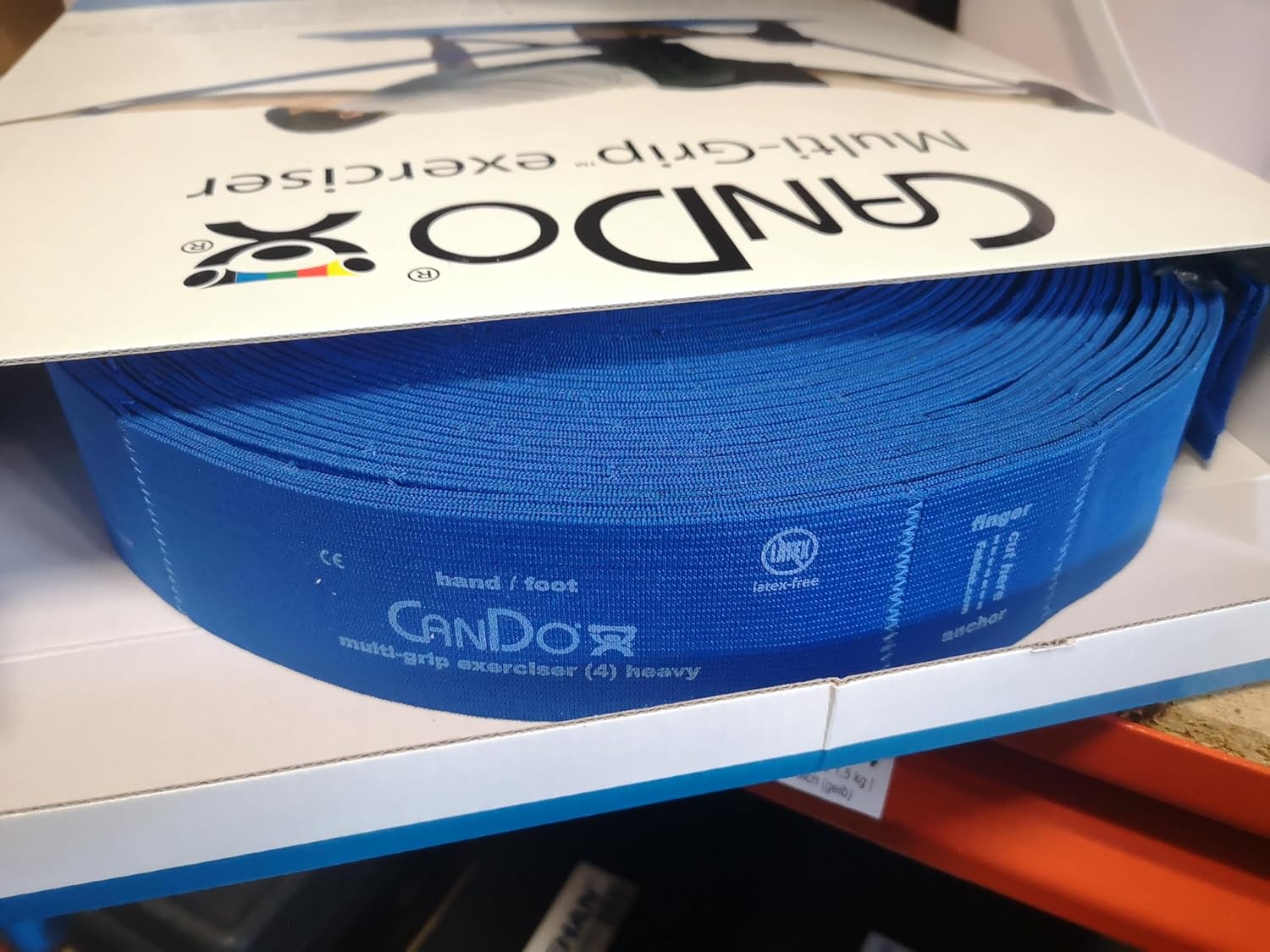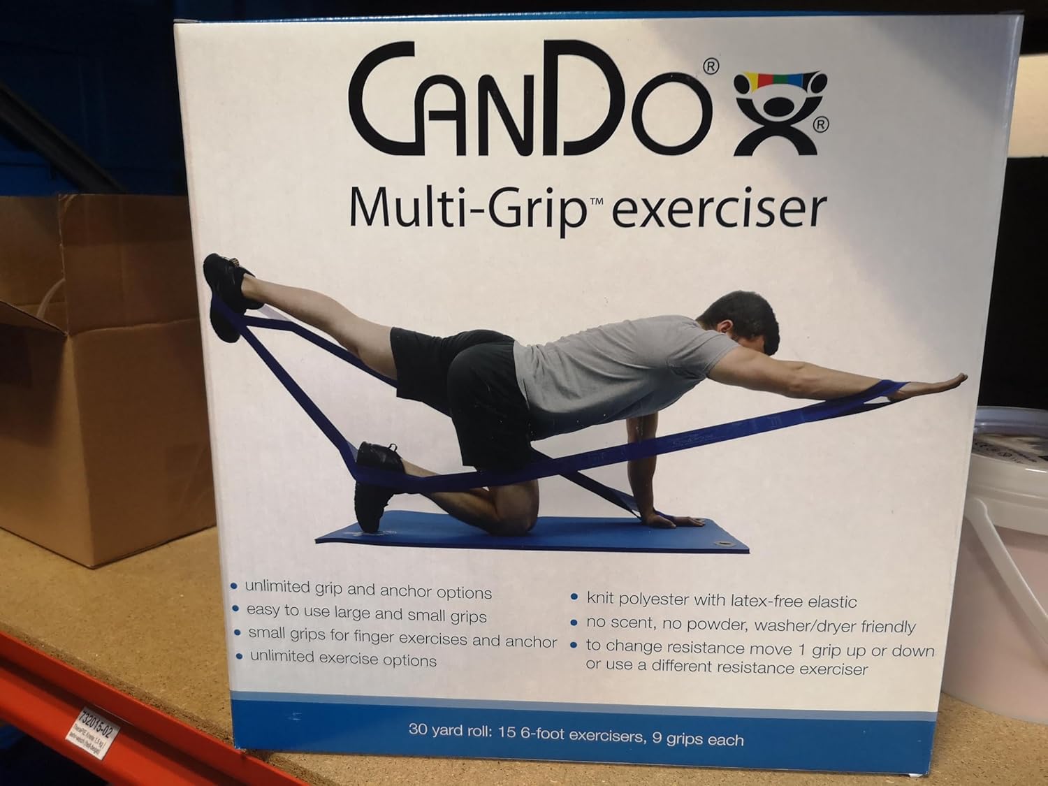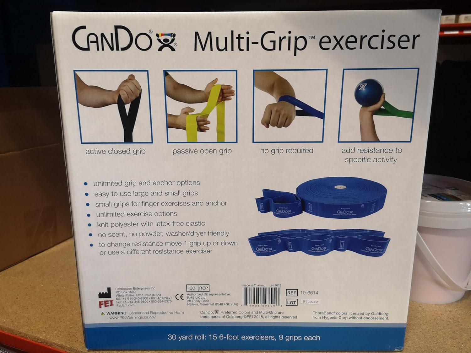 The CanDo Multi-Grip Exerciser is designed to provide unlimited exercise options to users who want to do various high impact performance exercises. Each exerciser contains both large and small loops that are easy to grip. Use the small loops as an anchor or for finger exercises. Use the larger loops around the hands and feet to perform high impact upper and lower body exercises. Easily change resistance by moving 1 loop up or down the exerciser, or using a different resistance progressively exercise with 8 different color-coded resistance levels. The CanDo Multi-Grip Exerciser is made of an unscented cloth that can be washed and dried. It does not contain latex or a powder coating. This thirty-yard roll contains 15 exercisers and has 135 large loops total. It is Heavy in resistance and is blue in color.