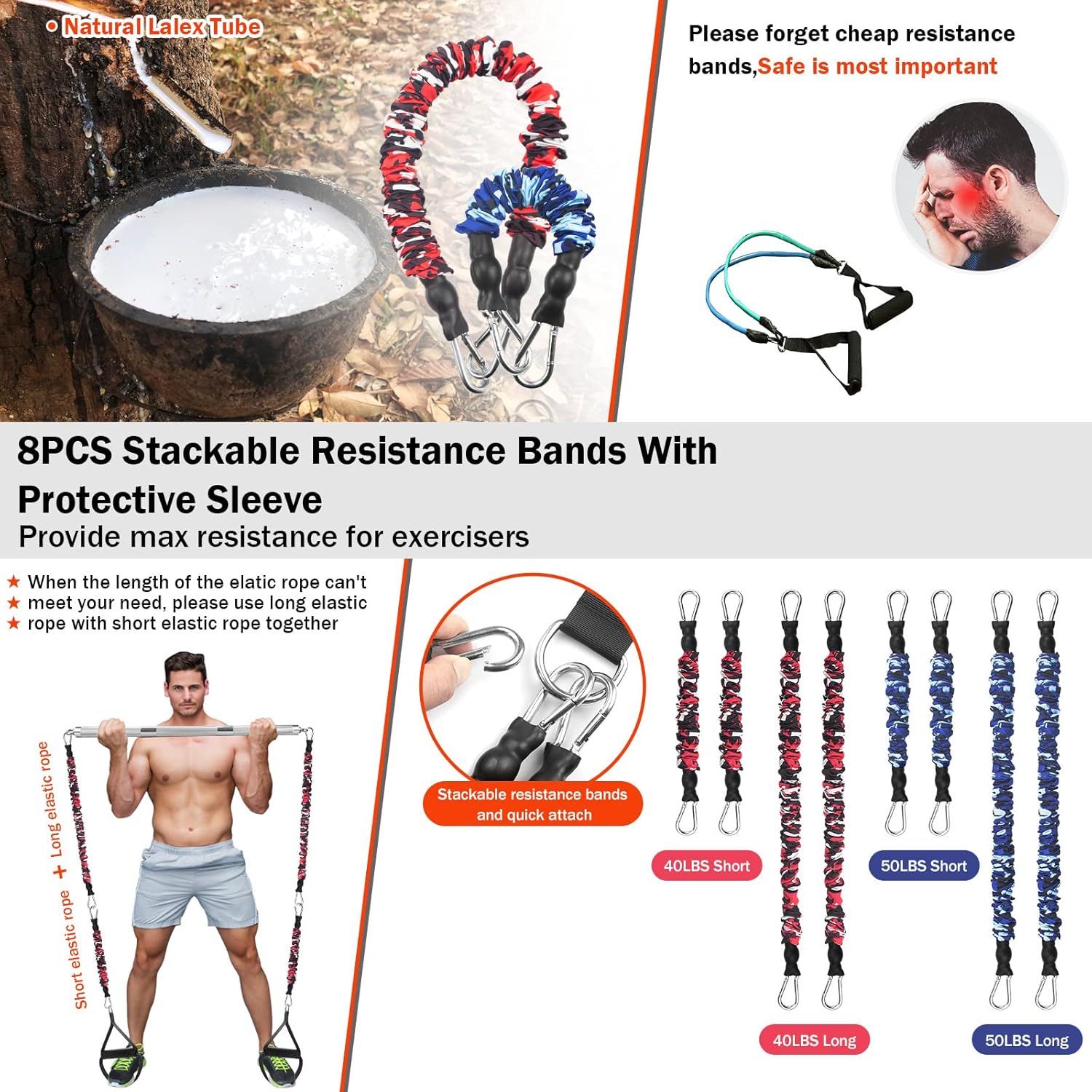 DASKING Portable Resistance Bar Set is equipped with 8pcs 40LBS/50LBS Anti-Break Stackable Resistance Bands,Mutifunction
