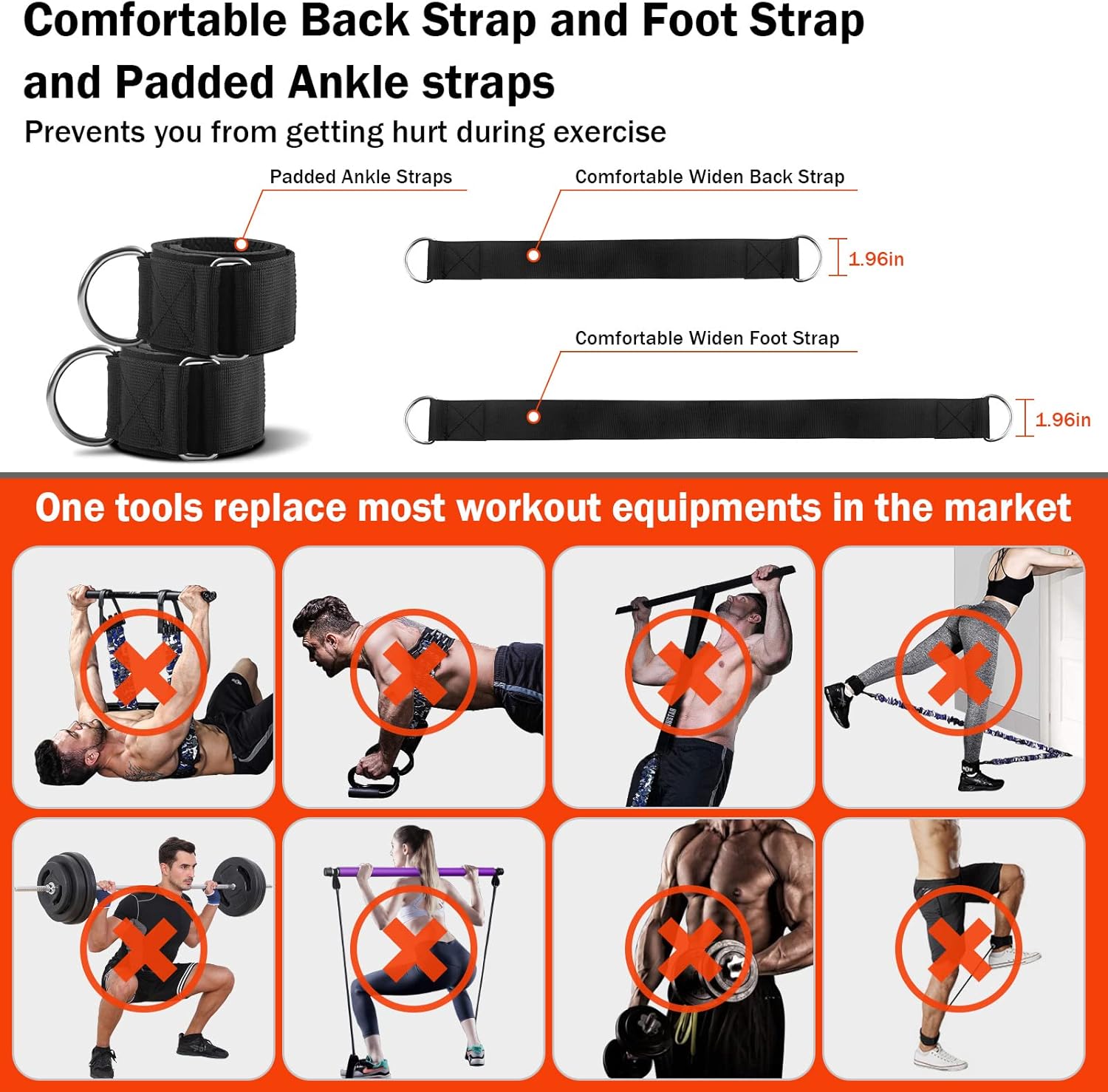 🔄🏋️♂️[Endless Exercise Options] Create dozens of workouts! Easily combine the bar, bands, straps, handles, and door anchor for exercises targeting arms, legs, chest, back, glutes, and core. (Examples: Lat Pulldowns, Rows, Chest Presses, Leg Extensions, Bicep Curls).
