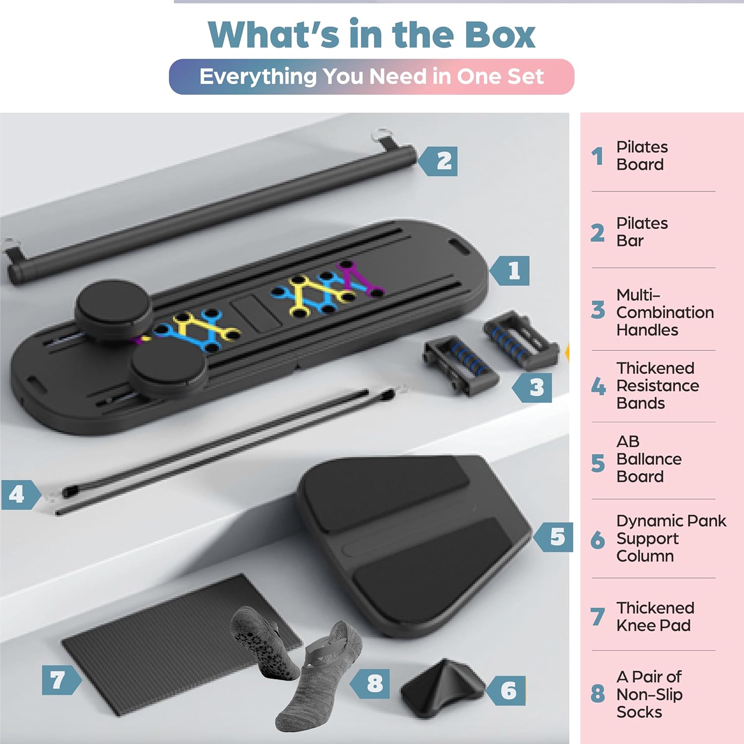 ✔️ Pilates Board – Sturdy base for all exercises.✔️ Non-Slip Socks (1 Pair) – Safety and grip during sessions.✔️ Balance Board – Enhance stability and coordination.✔️ Pilates Bar – For targeted muscle engagement.✔️ Dynamic Parts Support Column – Adjustable for versatile workouts.✔️ Multi-Consolidation Handles – Secure grip for resistance training.✔️ Thickened Rose Pod – Extra cushioning for comfort.✔️ Thickened Resistance Bands – Customizable intensity levels.