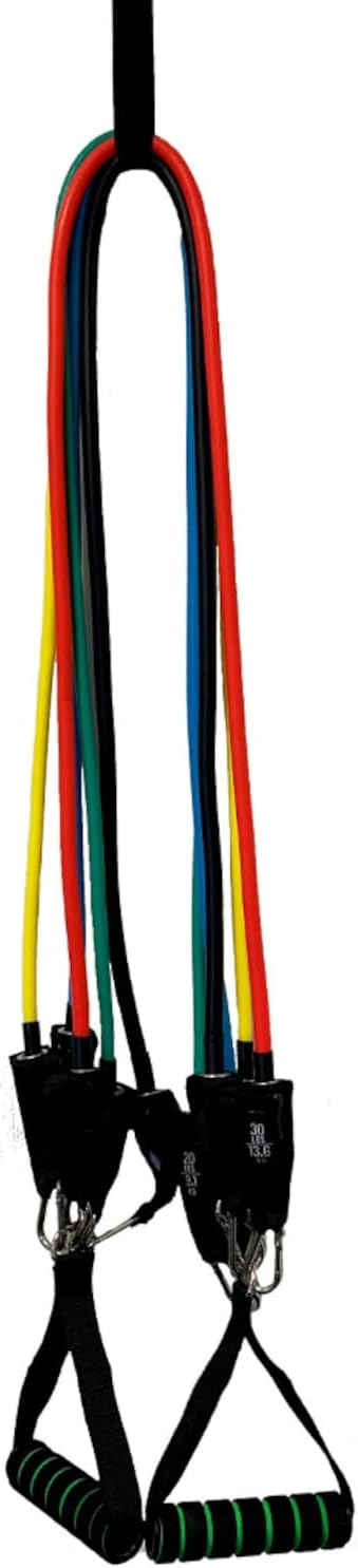 CHOOSE YOUR INTENSITY LEVEL: Includes 5 different colored bands, including a yellow band (10 lbs), blue band (20 lbs), green band (30 lbs), black band (40 lbs) and a red band (50 lbs); use them alone or combine any of them to increase intensity; combined maximum resistance of 150 lbs