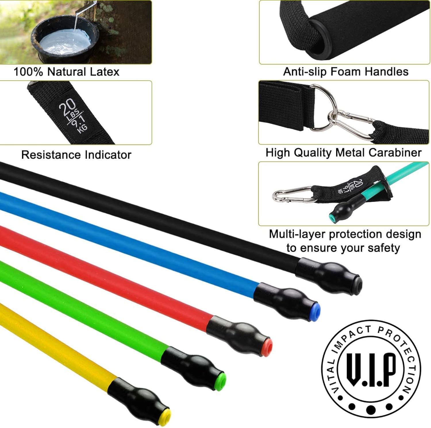 HIGH QUALITY: The exercise resistance band is made of natural latex and environment friendly. Strong wear resistance and perfect elasticity, resistant bands steel metal buckle for stronger strength and easy to use. Non-slip handle, comfortable, and absorbent. Exercise Bands Handles, Ankle Straps Door Anchor Carrying Pouch 5 resistance bands with different resistances (yellow 10 lb / 4.6 kg, green 20 lb / 9.1 kg, red 30 lb / 13.7 kg, blue 40 lb / 18.2 kg, black 50 lb / 22.7 kg), 2 Handles, 2 ankle straps, 2 door anchors and 1 drawstring carry bag, 1 training guide for fitness band. (Each piece of fitness band has 2 aluminium alloy buckles and 2 nylon braids as connection firmware on both sides). Versatile and Easy to Use – The resistance bands has 5 resistance levels. You can stack them as needed or use them individually. The Exercise band can reach a maximum of 150LB / 68 kg. Whether you are a beginner or an experienced person, you can use it easily. Since it is easy to carry, you can exercise in most places including legs, back, chest, buttocks, etc. (Note: Please pay attention to safety when using).