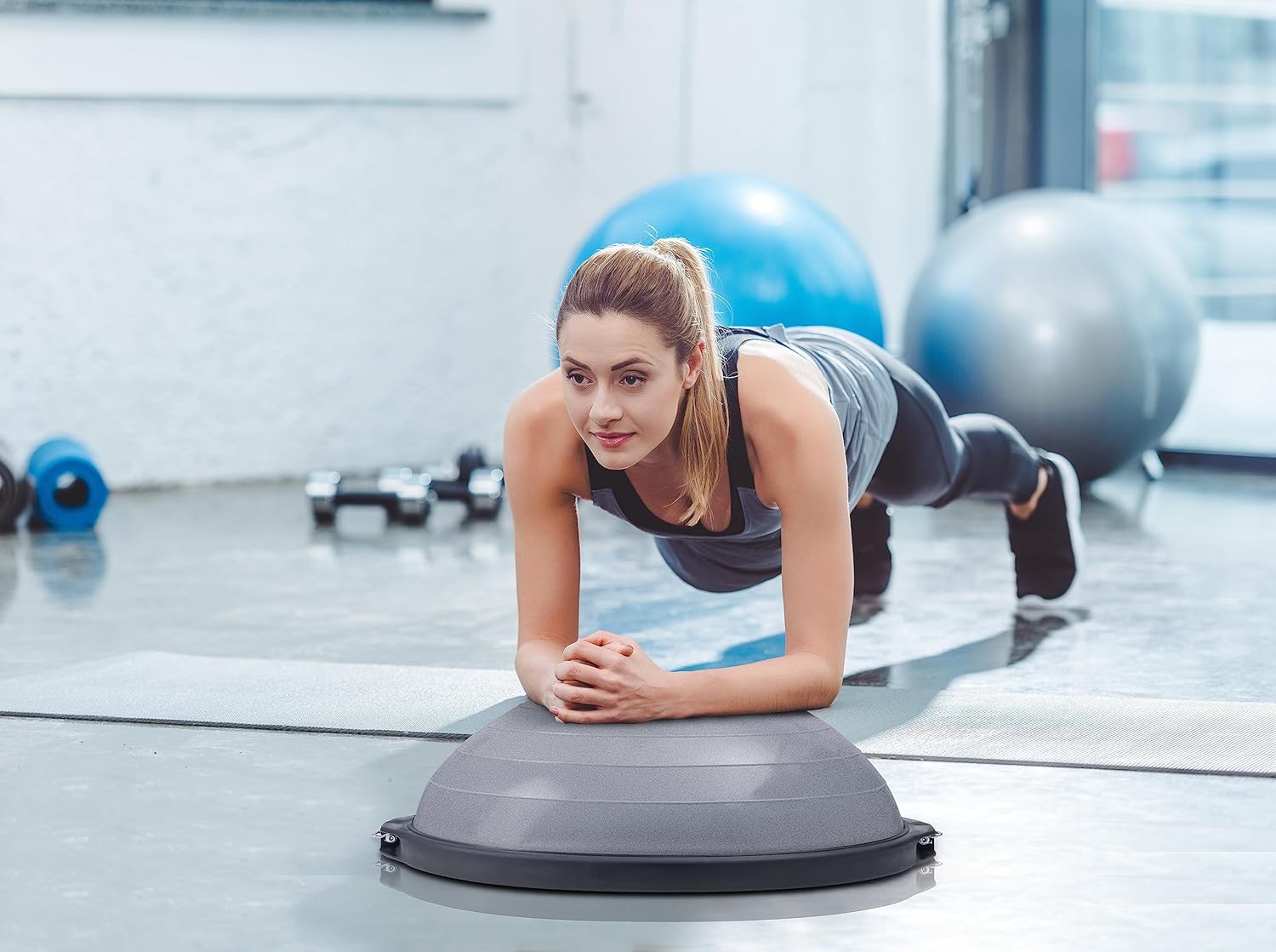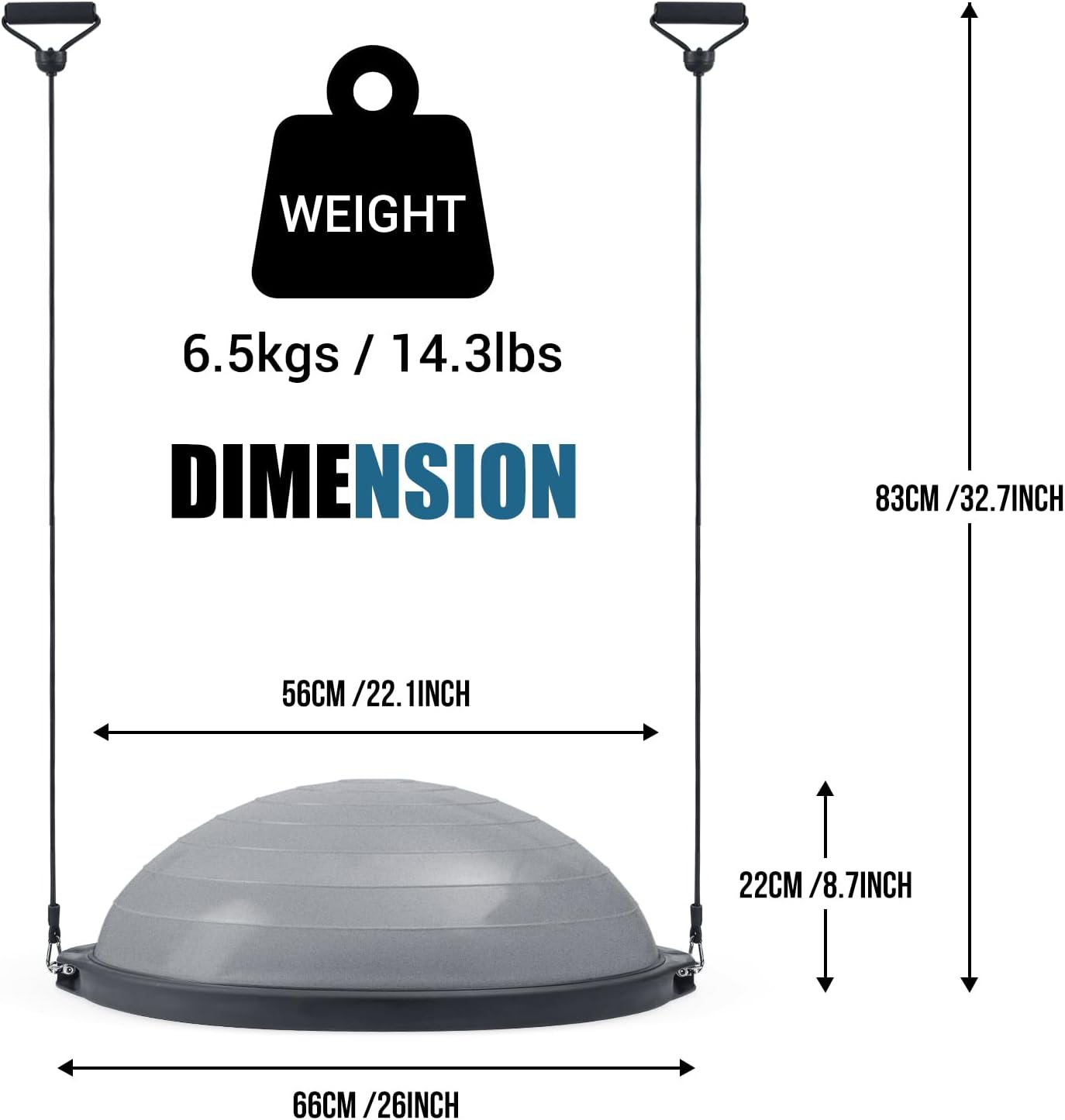 placing the flat side down to practice stability. You can advance your routine by doing squats, lunges, or step-ups on the ball. Take it even further by flipping the ball over to use while doing push-ups, planks, or burpees. Included are removable resistant bands that can attach to the sides of the ball. They aim to tone and strengthen your upper body.