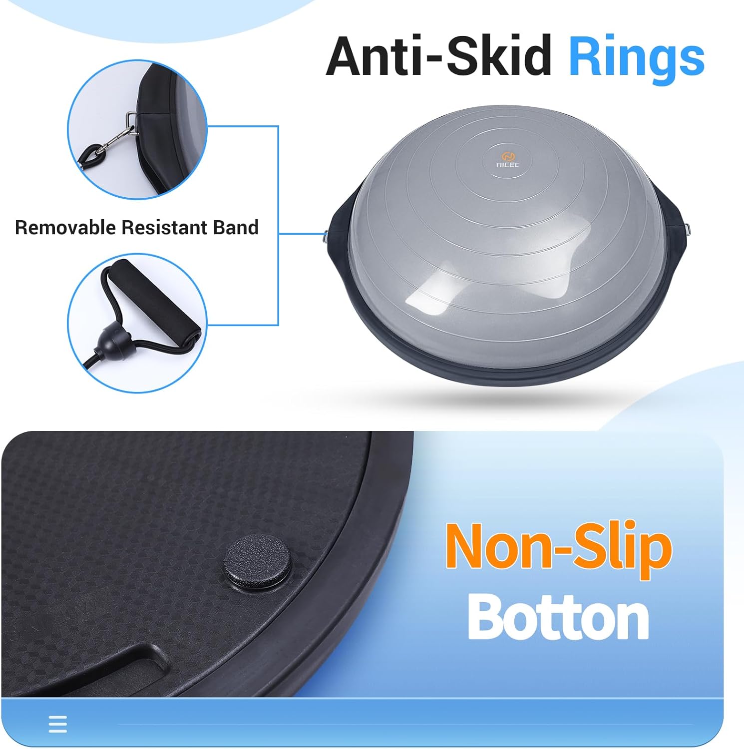 Made of industrial grade rubber and sturdy ABS plastic. Nice C half ball balance trainer is eco-friendly made and aims at bringing you non-toxic and chemical-free using experience. The high elastic material is designed to fit the most conditions. CLEANING-FREE: The ball surface is waterproof and stain-resistant – perfect for any use. Just wipe it with wet cloth to bring your new equipment back.