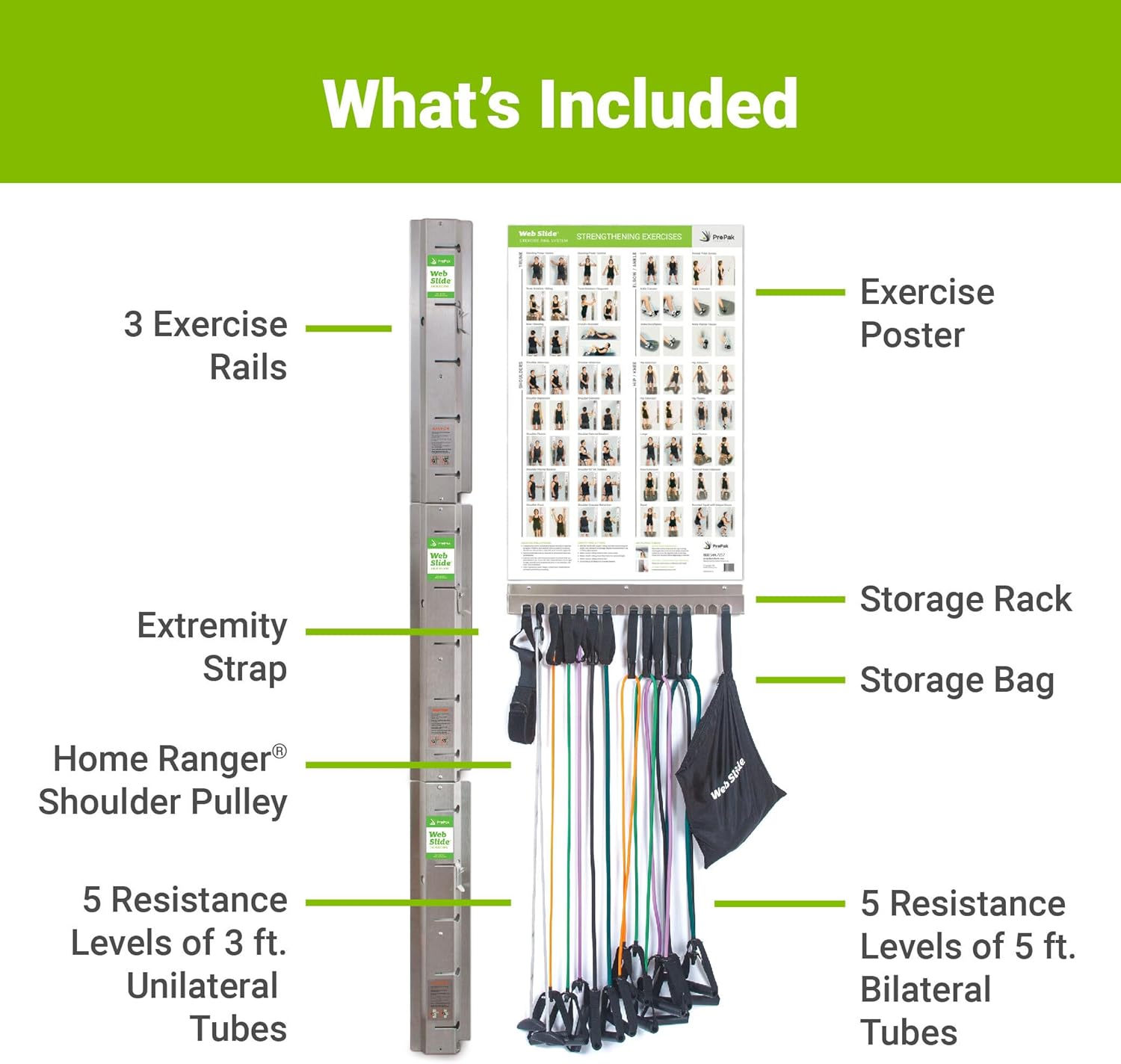 What’s Included. You’ll be ready to work out in minutes with this space-saving unit! This system comes with three Stainless Steel Exercise Rails (with mounting hardware and Safety Slides included), 1 Stainless Steel Storage Rack (with sixteen positions), 1 Exercise Poster, 1 Shoulder Pulley, 5 Unilateral, 5 Bilateral ExerBand Resistance Tubes, and 1 Extremity Strap. Each ExerBand Resistance Tube and the Shoulder Pulley comes with an attached Web Anchor Strap.