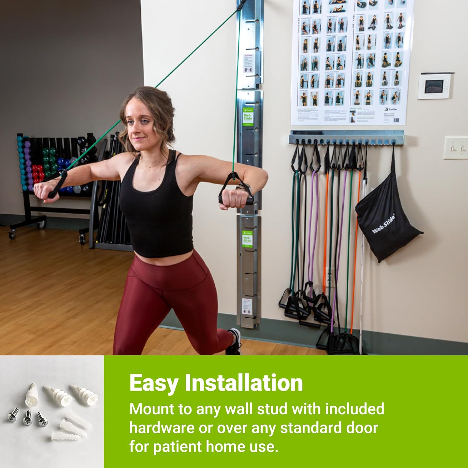 The Web Slide Difference. The Web Slide Professional System organizes your clinic and streamlines patient training sessions. Any resistance bands/tubing, pulley devices, or other exercise equipment that utilizes a Web Anchor Strap for door attachment can be set up and ready to go in seconds with a Web Slide Exercise Rail-no door required!