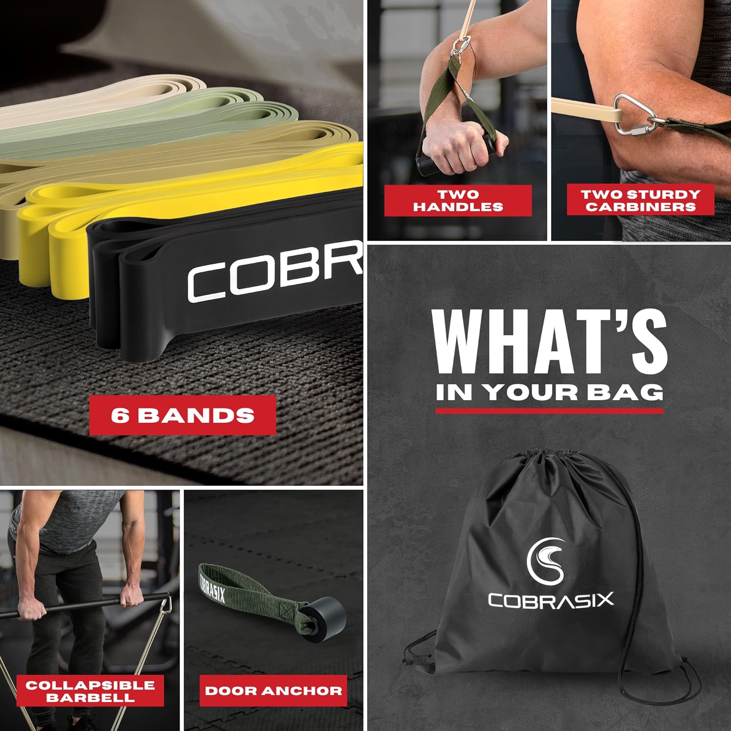 DURABLE NATURAL RUBBER! CobraSix natural latex rubber resistance bands with layered construction are 3x more durable than other elastic bands for exercise. The fitness bands also come with strong rubber handles, attachement hooks, a door anchor and a bar for resistance bands