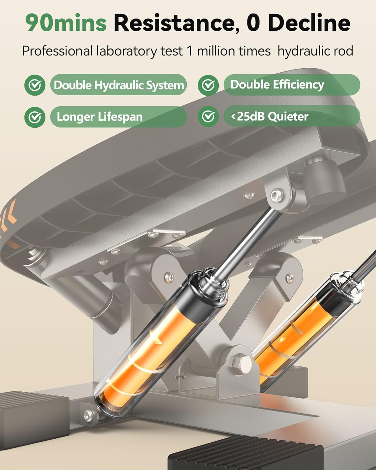 [90MIN Continuous Resistance]Built with a European standard hydraulic cylinder strengthen, this twist stepper will maintain high resistance in each exercise cycle to help you burn fat quickly. After 100k cycle hydraulic test, the resistance can last for up to 90 minutes,and excellent gas sealing will no oil leakage.