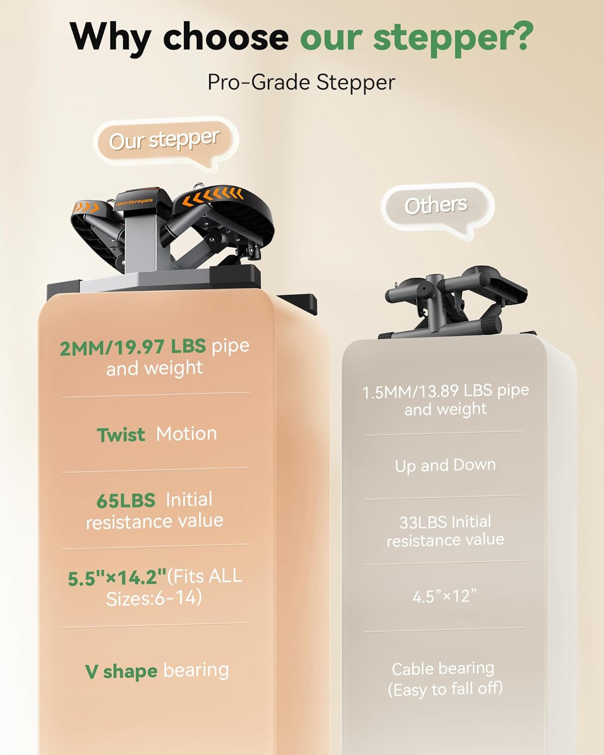 【2025 Updated Stair Stepper】Compared to the traditional cable-pully mini stepper, we used 2mm high quality steel and precision bearings.After thousands of tests,we make sure our step machine are safe and durable to support 600lbs+.
