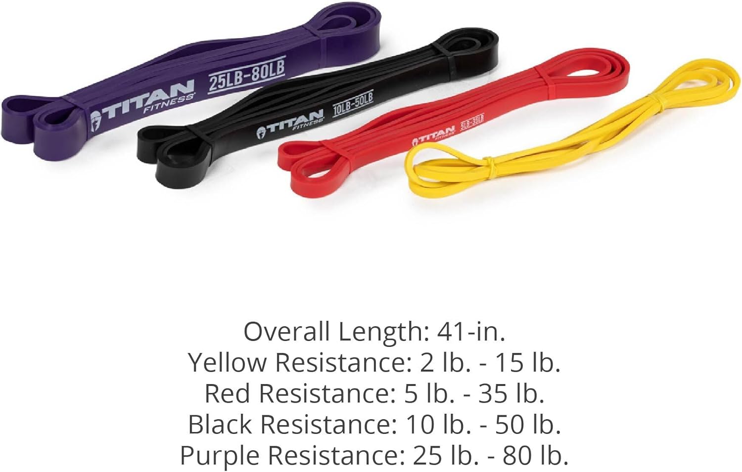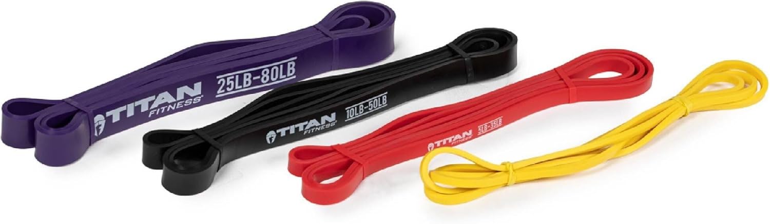 The Multi-Pack Light Resistance Bands include 4 different strength-resistant bands. Made from durable latex, these resistance bands aid in pull-up assistance, add resistance to stretches and body weight exercises, and add resistance to the barbell for a variety of lifts. Each set of resistance bands measures 41-inches in length and features the Titan Fitness logo. The yellow bands (2-5 lb. resistance) are for light resistance for stretching or bending exercises. The Red bands (5-35 lb. resistance) are for medium resistance for strength training or calisthenics. The Black bands (10-50 lb. resistance) are for strong resistance for light pull-up assistance or strength training, and the Purple bands (25-80 lb. resistance) are made for ultra-resistance for intermediate or light-weight beginners with pull-ups.