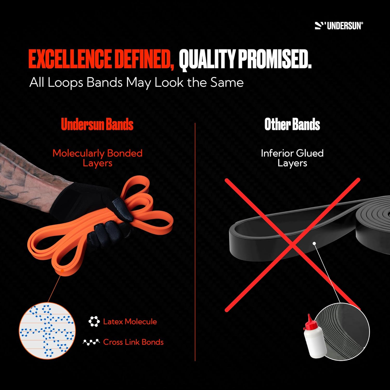 SUPERIOR STRENGTH. PREMIUM CRAFTSMANSHIP — Experience the pinnacle of workout bands resistance with our multi-layered bands, created through a superior molecular-bonding process for unmatched strength and resistance. Ignore the noise from other workout equipment brands. Visible layers in a band are a clear sign of inferior, glued construction. Choose Undersun stretch bands for exercise and get lasting performance.