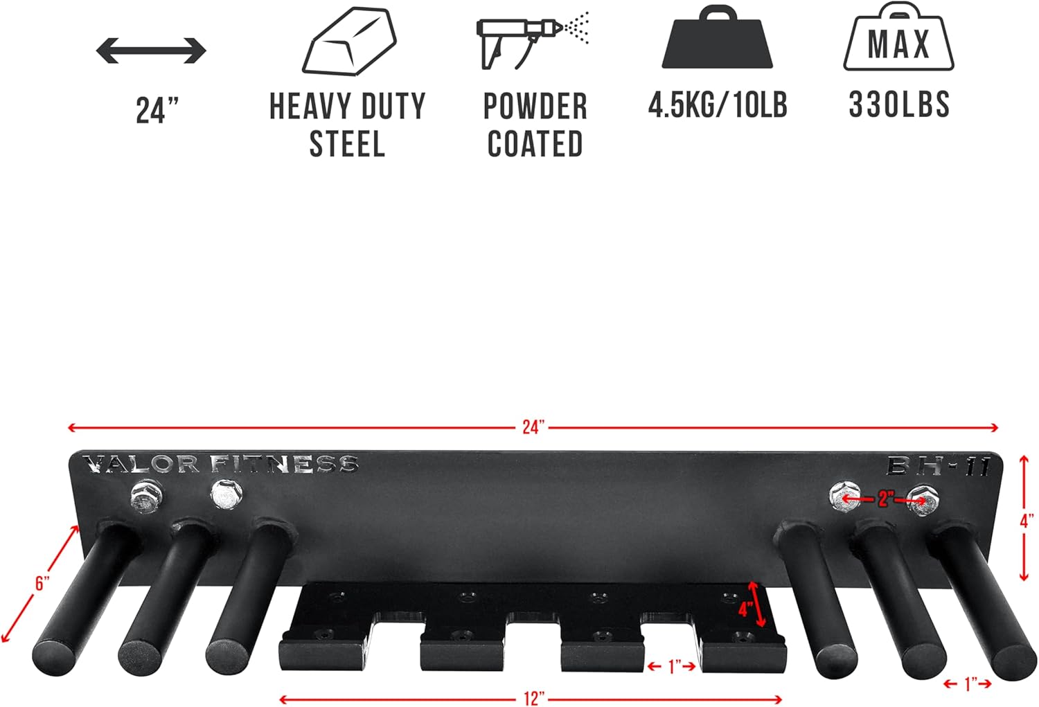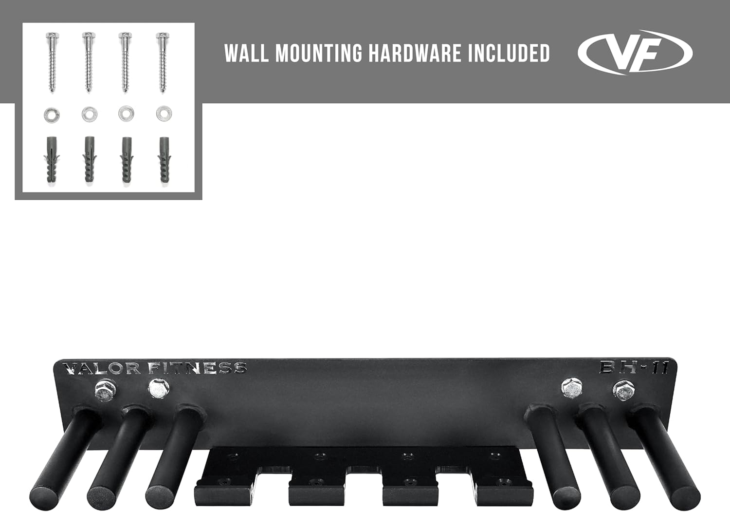 The Valor Fitness wall mounted universal multi-purpose exercise equipment holder. The wall mounted hanging shelf will help with all your organizational and storage solutions for your home gym. It is the perfect heavy duty vertical wall mounted storage rack for a variety of your exercise equipment and accessories. This fitness equipment and band storage rack includes 6 pegs and 3 bar holders. Powder coated and constructed from heavy duty steel with a durable layer of plastic on the barbell holders. This protects the storage organizer and barbells from unwanted scratching, denting, damage, or premature wear and tear. The maximum weight for the this exercise wall mount hanger is 330lbs. It is perfect for large and small space storage solutions. The storage equipment bar holder includes hooks and pegs for your barbells, resistance bands, jump ropes, weightlifting belts, gym bags, weight vests, chains and other attachments and accessories. The innovative design will maximize storage space in your home gym, garage gym, or commercial gym. This wall mount workout shelf includes hardware for simple installation with holes spaced 16” and 20” apart which is optimally designed to fit on internal wall studs or drywall.