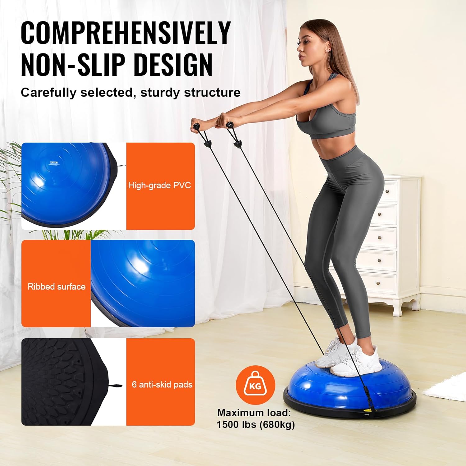VEVOR Half Exercise Ball Trainer, 23/26 inch Balance Ball Trainer, 1500lbs Capacity Stability Ball, Yoga Ball with Resistance Bands & Foot Pump, Strength Fitness Ball for Home Gym Full Body Workout