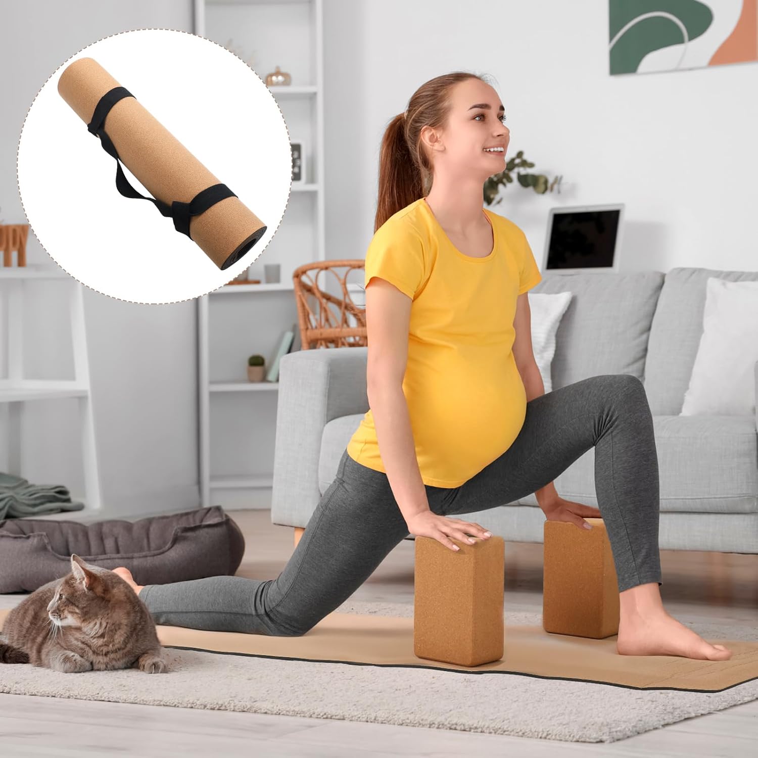 The yoga mat rolls up compactly, and the included yoga strap makes it easy to carry. Lightweight cork yoga blocks are ideal for stretching and precise pose adjustments.