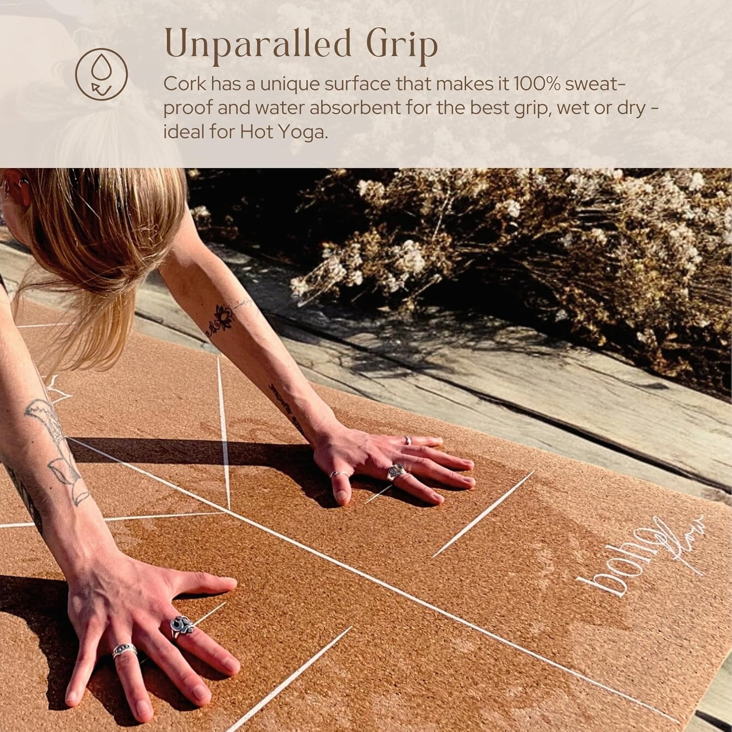 TIRED OF CHEAP, SLIPPERY PLASTIC MATS? Upgrade to the Boho Flow cork yoga mat with natural rubber backing. Enjoy superior grip, durability, and eco-friendly materials that are safe for you and the planet — unlike cheap PVC and TPE mats.