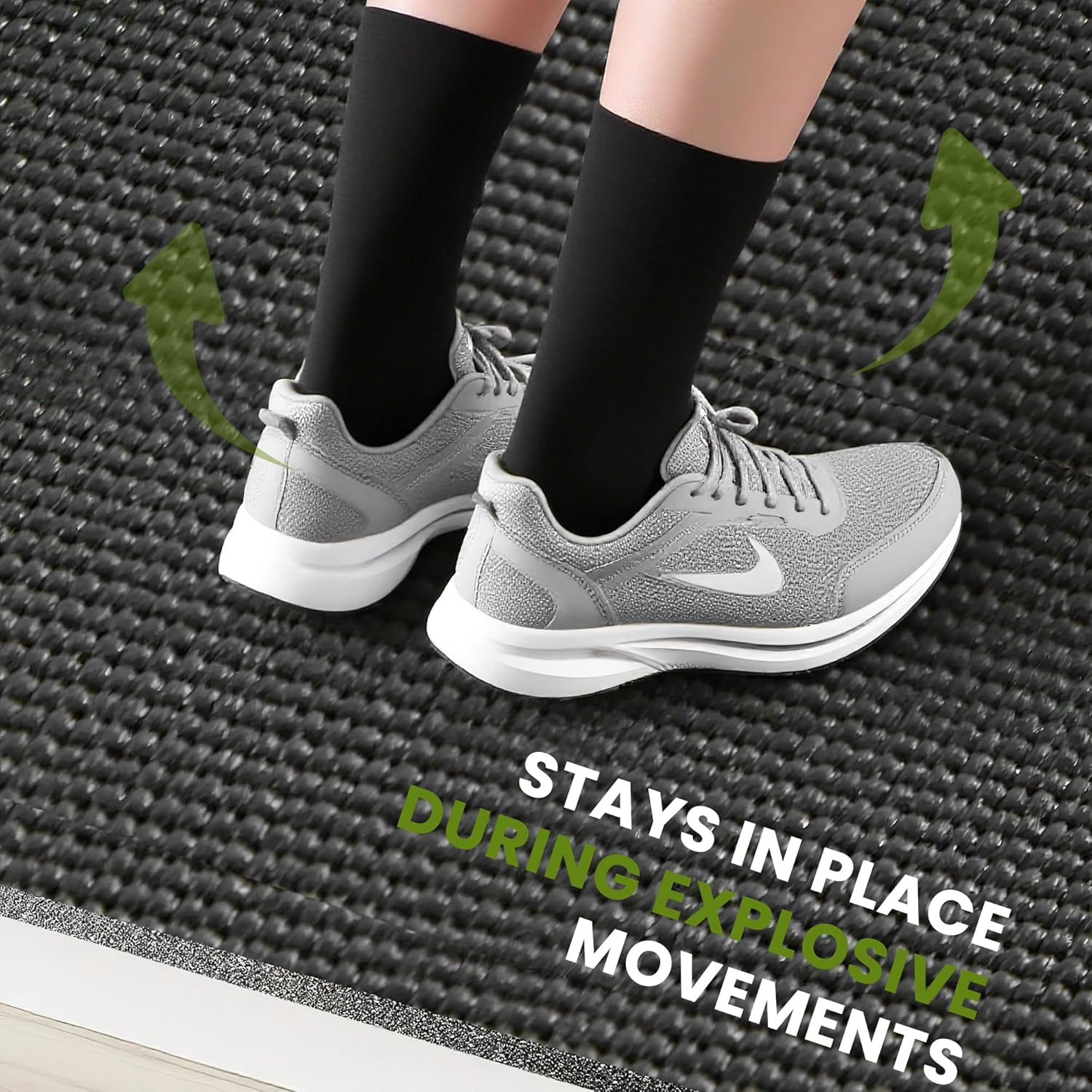 【Easy to Clean, Roll & Store】 Our large exercise mat is water-resistant, sweat-proof, and built for real use — whether you’re wearing shoes or not. Simply wipe off dirt, dust, or sweat with a damp cloth in seconds. It rolls up easily and can be stored in a corner, closet, or behind furniture. Maintenance-free and always ready for use.