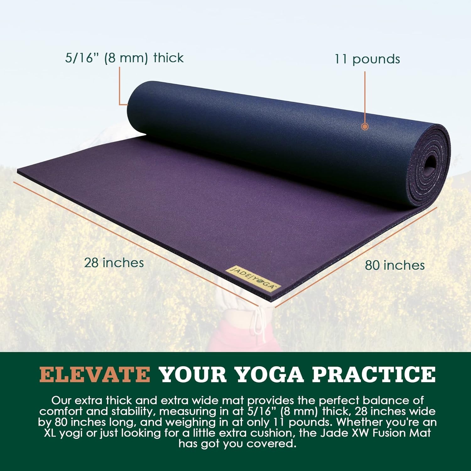 EXTRA LONG, EXTRA WIDE, EXTRA THICK: At 5/16″ thick, 28″ wide, and 80″ long, Jade’s Fusion XW yoga mat is the perfect mat for the XL Yogi. With its 5/16″ thickness, 28″ x 80″ size, we created it to be larger than regular mats, giving you extra cushion and added room while providing superior traction that keeps you safe and secure during your practice. Perfect for yogis who want extra space and comfort.