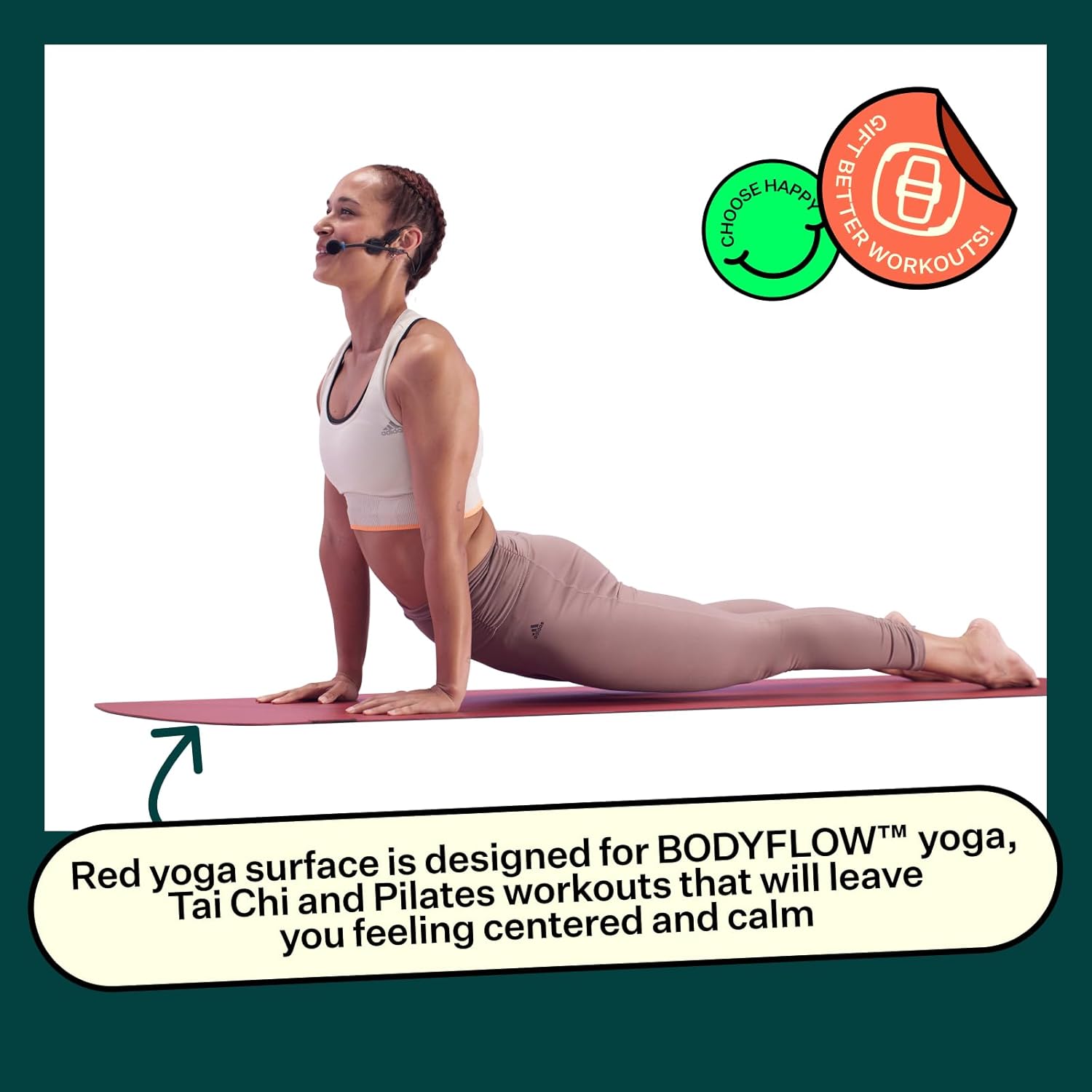 Semi-closed cell surface for hygienic performance. Easy to clean and ideal for bare feet, socks and hands (shoes should not be worn on the red surface). The high-density eco-PVC cushions from hard floors, yet delivers supportive grip to avoid sinking and sliding, and help you balance, and hold poses.