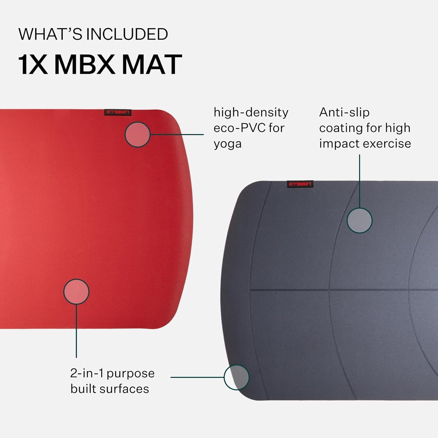 The Les Mills MBX MAT has two surfaces. The red surface is perfect for any style of yoga, with high-density eco-PVC delivering the right stability to strike challenging poses. The grey surface is designed for functional and high impact exercise, featuring anti-slip coating to keep you anchored during the sweatiest workouts.