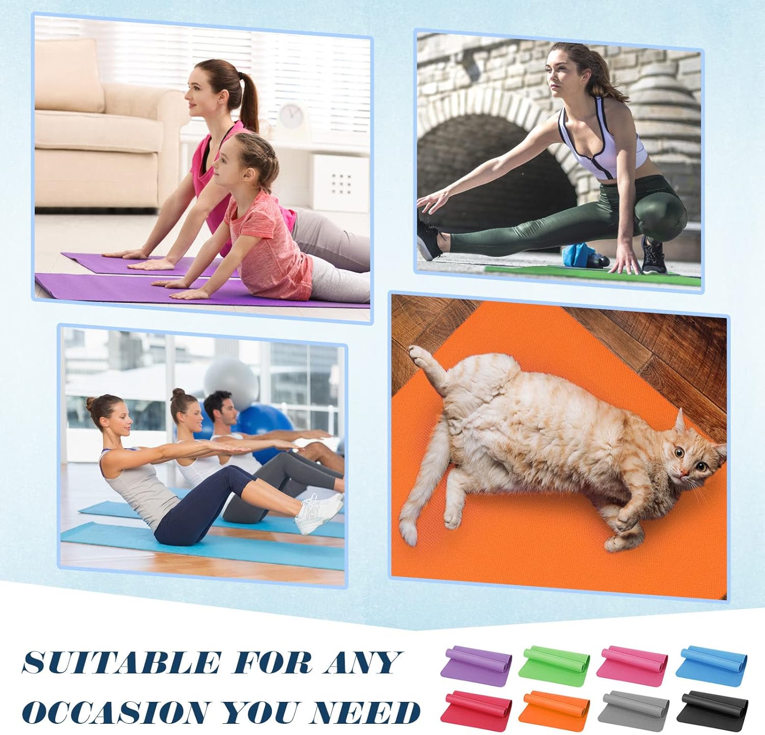Wide Application: durable, waterproof and easy to clean, the Pilates mats are suitable for different kinds of fitness, exercise, classroom and family activities, the lightweight yoga mats are easy to transport, and can also be applied for outdoor activities like camping, fishing, picnics and the beach