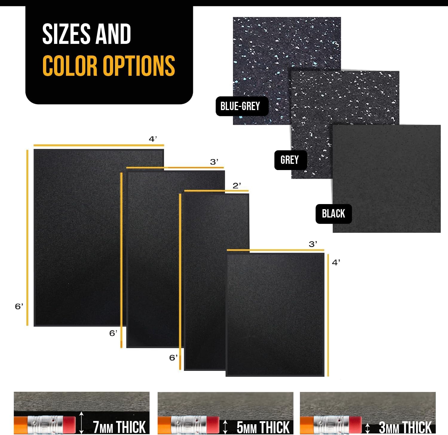 Reminder: 7mm (9/32″) 4’x6′ mats are available in solid black, black with grey speckles, and black with blue & grey speckles
