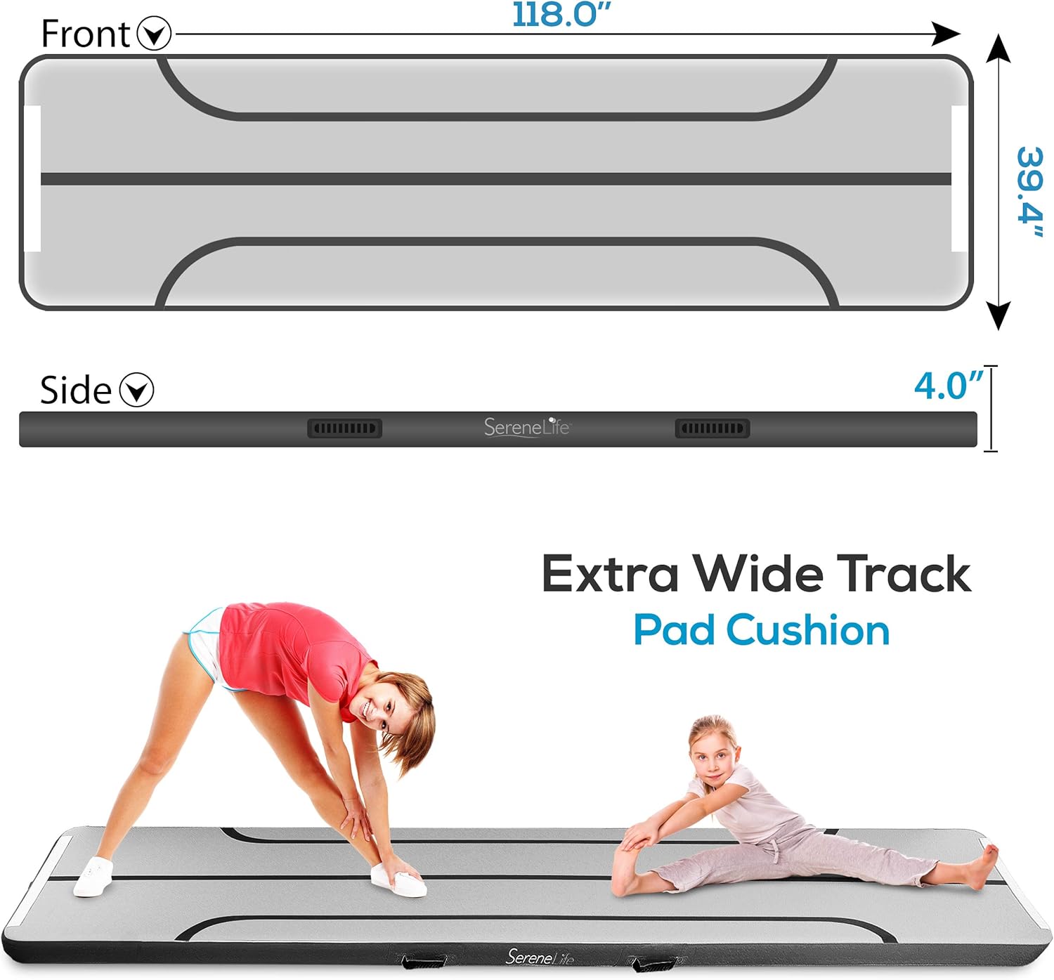 9. 8 FEET LONG: This 9. 8+ feet air mat gymnastics Tumble Track has a total inflated size of 118. 0″ X 39. 4″ X 4. 0″ Inch (lxwxh) and provides extra-wide Track pad cushion for full-body support for the stunt, back handspring, hand stand practice, and more
