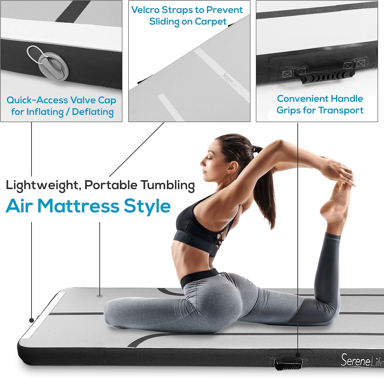 QUICK INFLATE ELECTRIC AIR PUMP: This gymnastics air floor mat inflatable gym mat has a quick-access valve cap and comes w/ 120V electric air pump for fast and easy inflating/deflating. Also has handle grips and velcro straps to prevent sliding