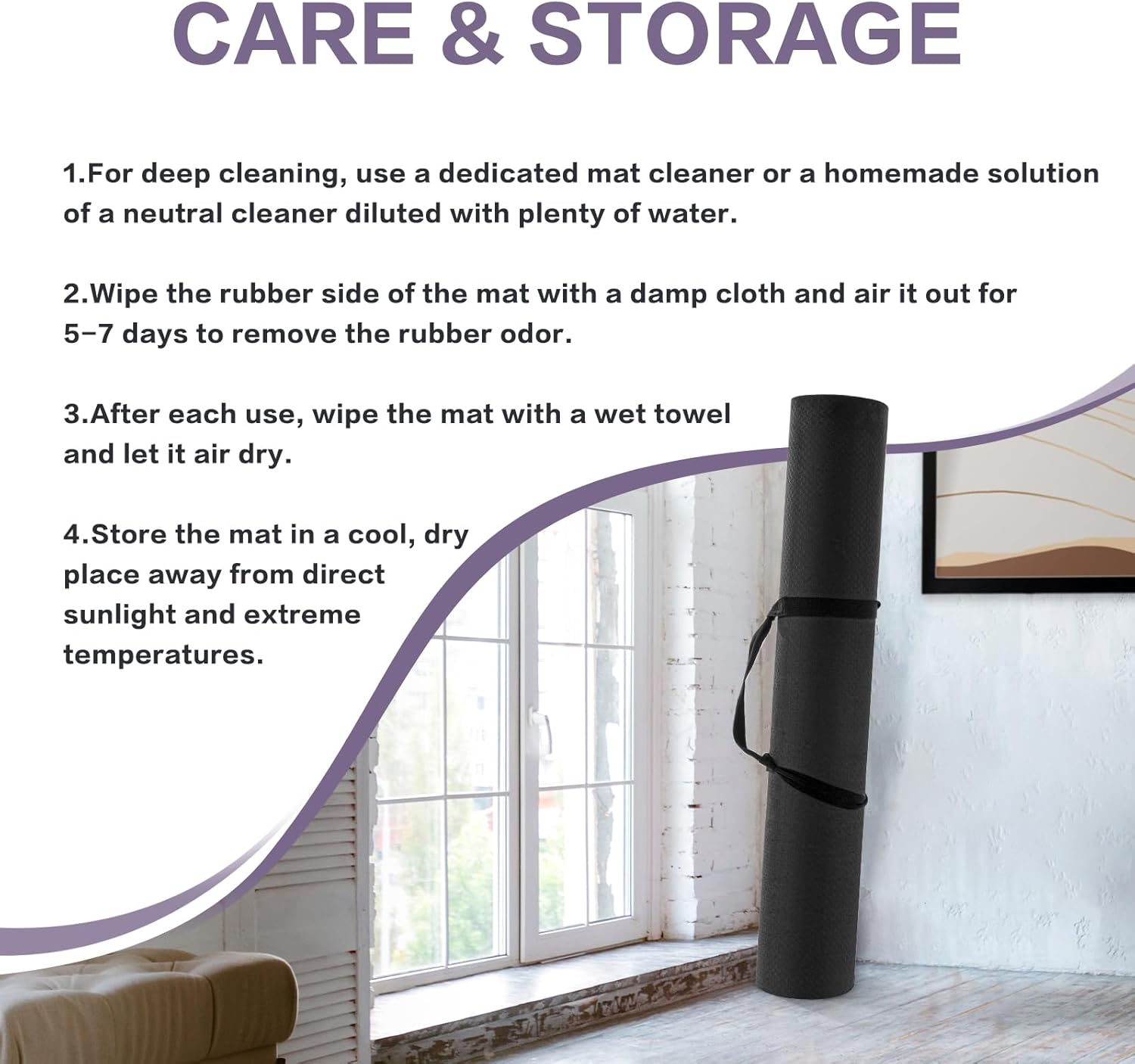 CARE INSTRUCTION – 1. All natural rubber possesses a harmless rubber aroma. Wipe the rubber side with a damp cloth and place it in a well-ventilated area for 5-7 days, allowing the scent to gradually fade. 2. Store the yoga mat in a cool, dry place away from direct sunlight and extreme temperatures.