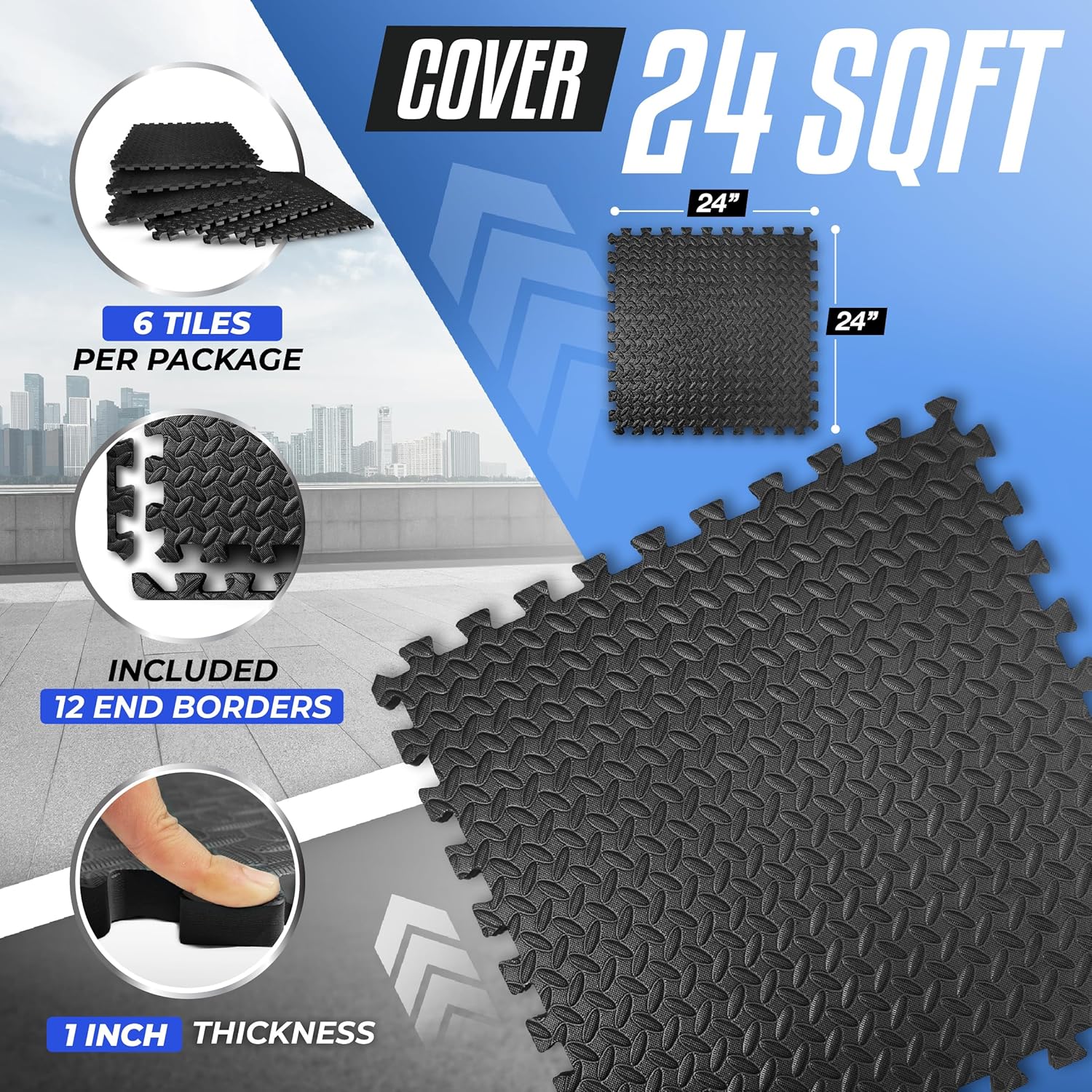 COVER UP TO 24 SQ. FT: Includes 6 tiles with a greater thickness of 1″ ). Each interlocking foam tile is or 24″L x 24″W