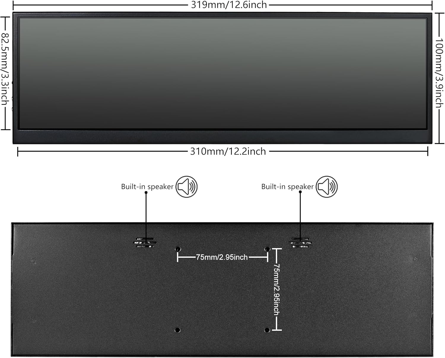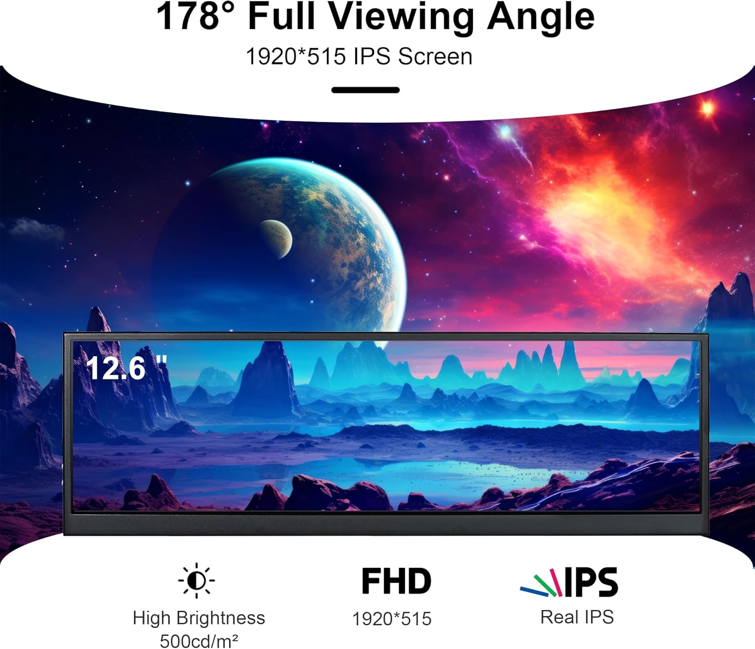 【Specification】FHD IPS Portable Monitor is made by AAA+ quality lcd panel. 1920×515 high resolution, 3-5 ms response time, 178°wide viewing angle, 60Hz refresh rate, 1000:1 contrast ratio. 12.6 inch DIY stretched bar display