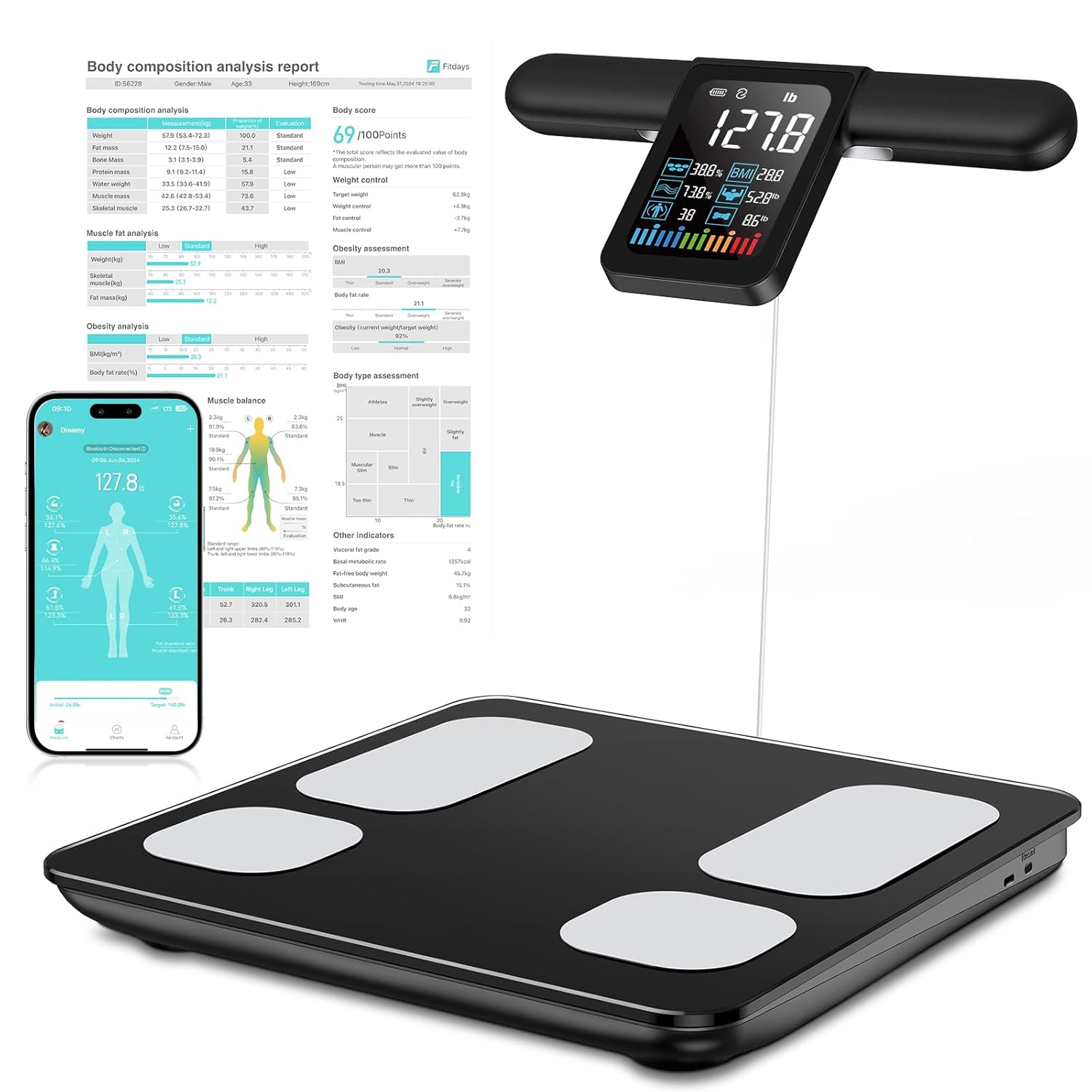 28 Body Composition Biometric Analysis: This body composition scale a smart tool for comprehensive body composition analysis. It accurately measures weight, body fat rate, body water rate, muscle mass, bone mass, BMI, bioelectrical impedance, segmental fat and muscle distribution, and more. Providing detailed insights into your body composition and help you track your health and fitness schedule.