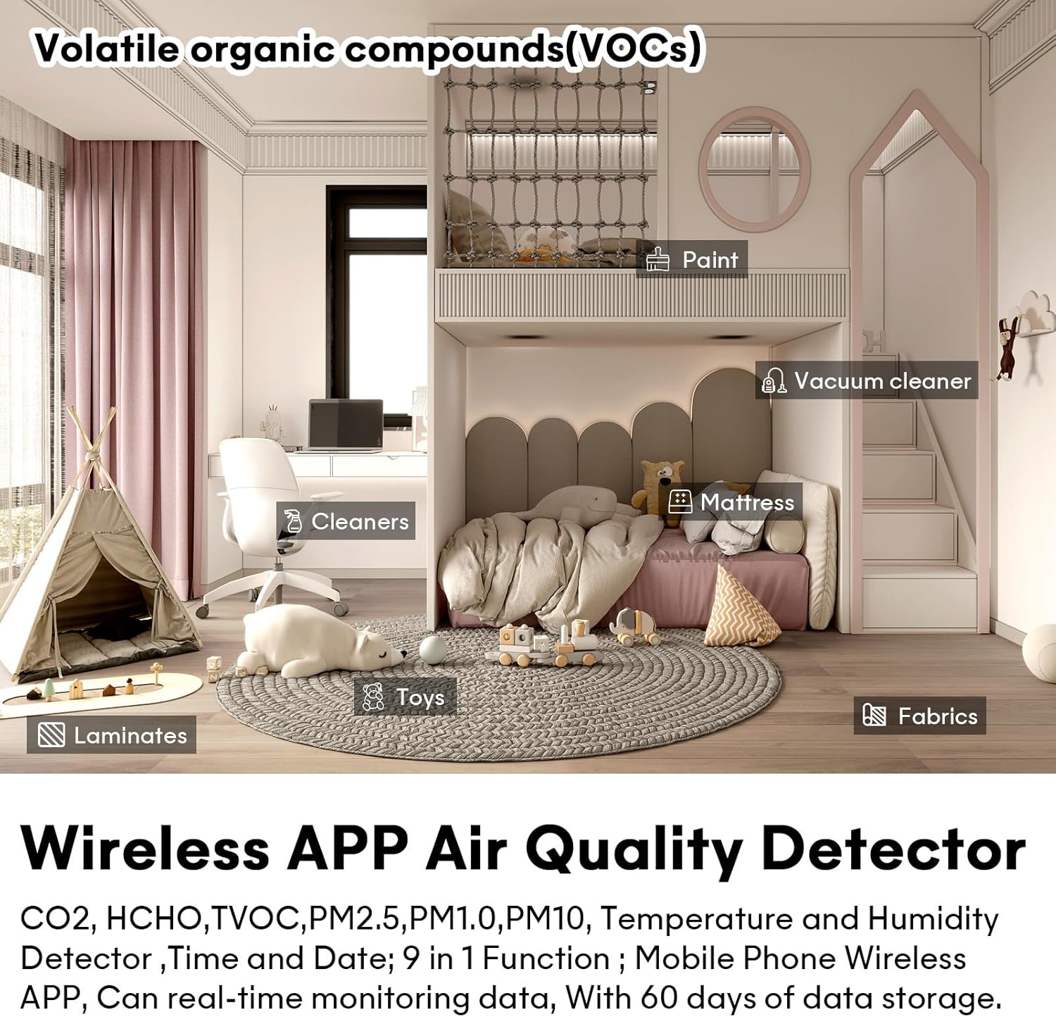 Easy to Use and Install: Designed with user-friendliness in mind, the monitor is simple to set up and operate, making it accessible for anyone concerned about indoor air quality without the need for professional installation.
