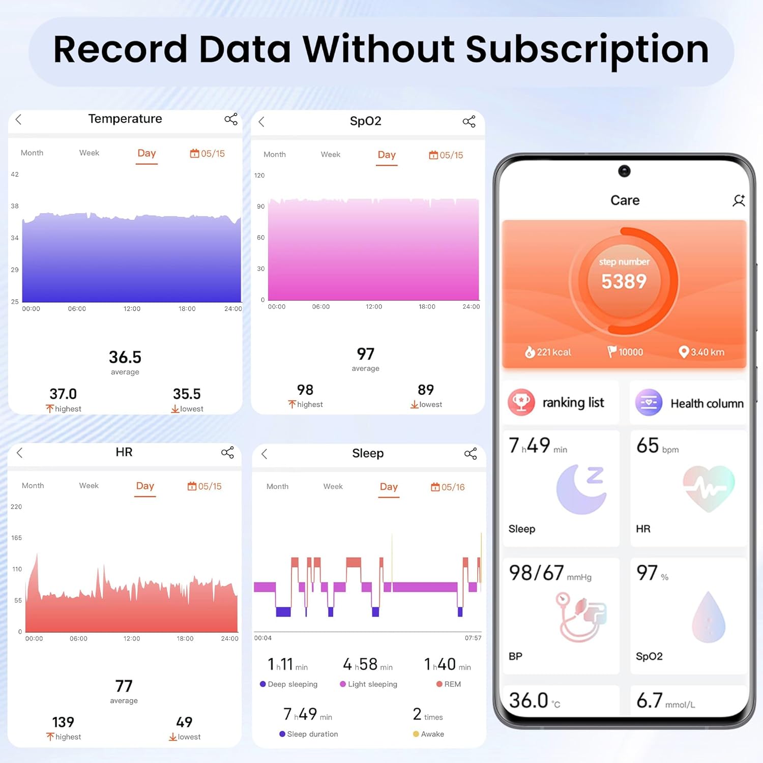 【24/7 health monitoring】 The fitness tracker watch monitors heart rate (abnormal warning), body temperature (high temperature reminder), blood oxygen level and sleep quality (deep sleep, light sleep, awake time, sleep duration) in real time. The data is synchronized to the APP in real time, supporting long-term storage and intelligent generation of health analysis reports and helps you manage your health in all aspects.