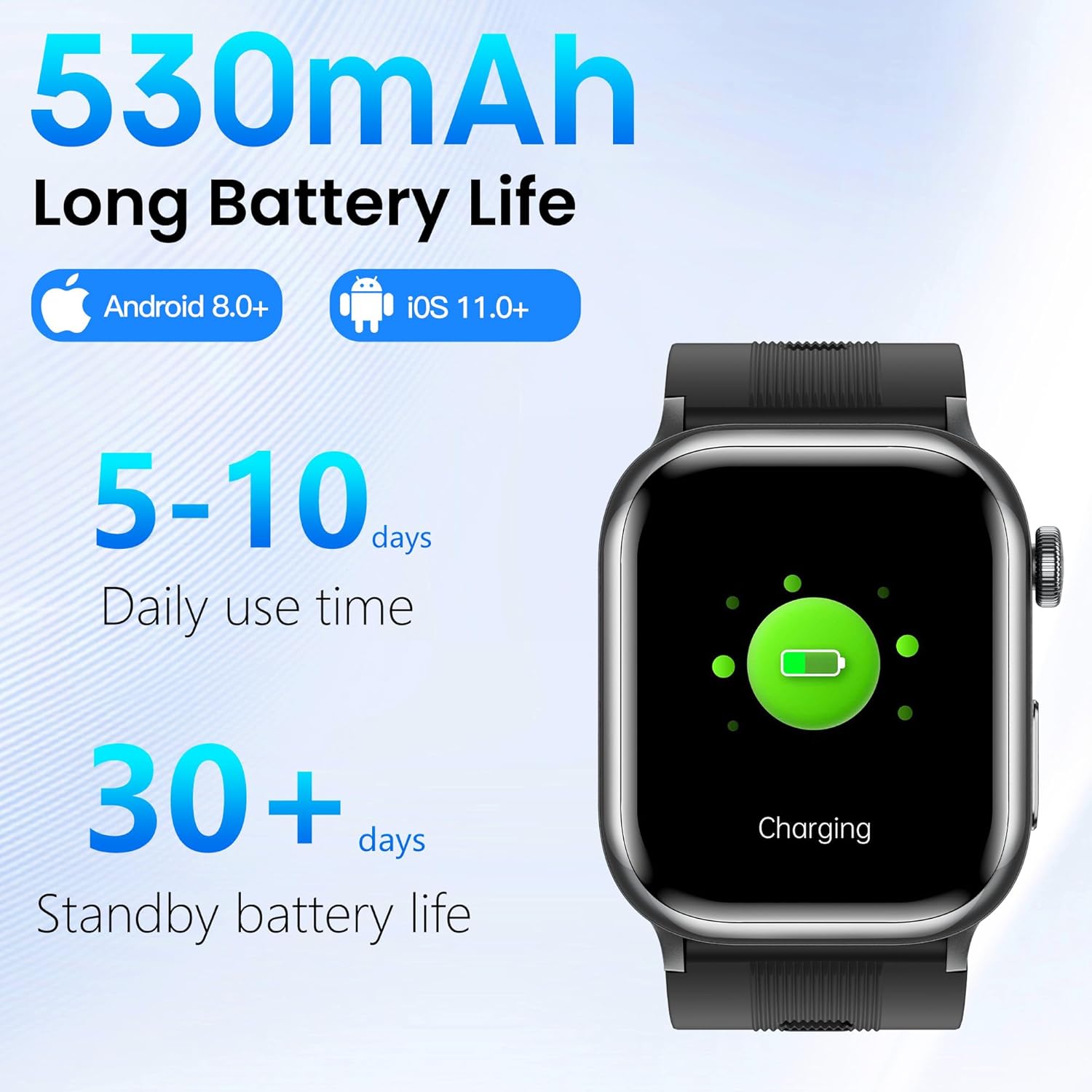 【530mAh long battery life & multi-function】The sports watch is compatible with Android 8.0 and iOS 11.0 and above devices, equipped with a 530mAh large-capacity battery, and the low-power design allows you to use it for 5-10 days on a single charge, and the standby time is up to 30 days. The pedometer integrates practical functions such as breathing training, weather, alarm clock, camera, music, sedentary reminder, stopwatch, timer, mobile phone search, calculator, etc. to meet daily life.