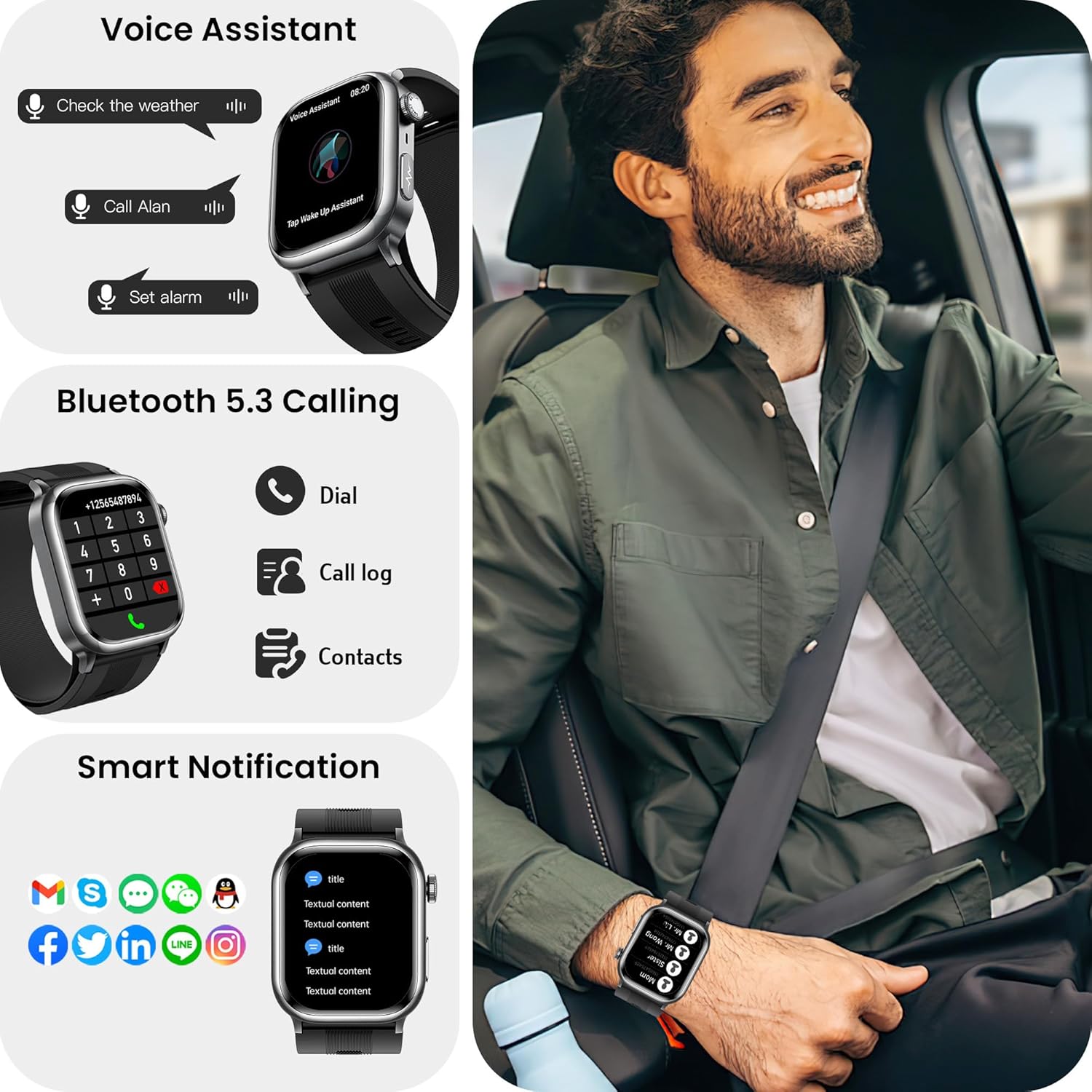 【Bluetooth 5.3 Call & Smart Notification Assistant & Smart Assistant】The phone watch uses Bluetooth 5.3 technology to achieve faster and more stable connection, support making/receiving calls, viewing call records, and adding contacts. Real-time synchronization of text messages and various APP notifications, important information will not be missed. With the voice assistant, you can check the weather, set alarms, etc., making daily operations more convenient.