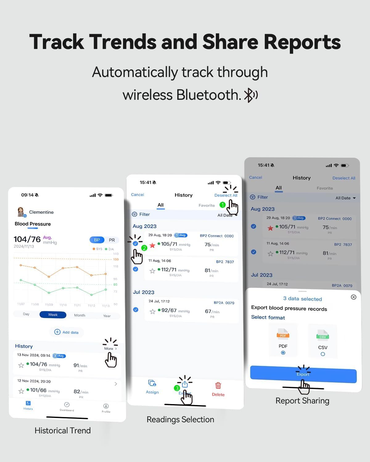 【BUILT-IN BLUETOOTH】- Multi-user record management on ViHealth app. Free to access, review and share records & reports (PDF & CSV) on your iOS or Android