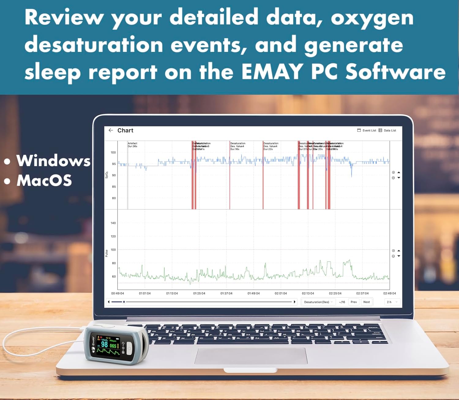 Free PC Software & iOS/Android App : 1. Download and review your historical data second by second 2. Export the granular data as CSV file for sharing & analysis 3. Generate professional oxygen report with crucial information such as oxygen & HR trends over time, ODI data to share with your physician