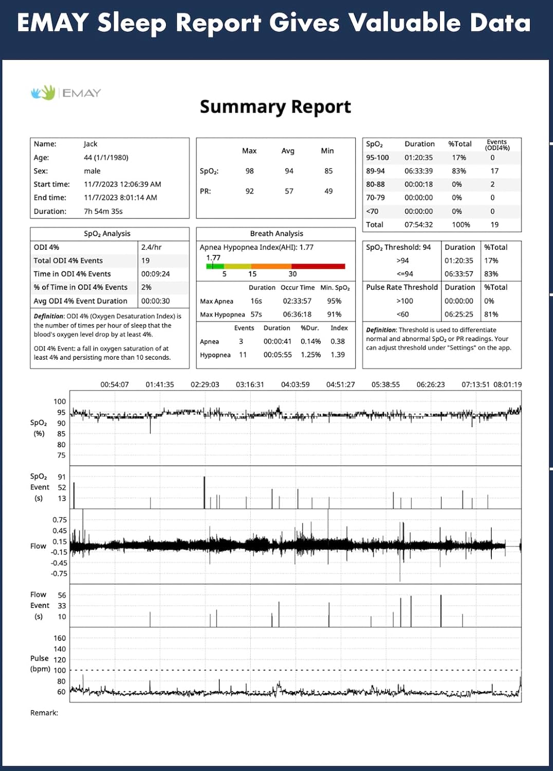 Our powerful and free PC software allows you to download, review and analyze your overnight data and events. Export the report (AHI & ODI) as PDF to share with your physician easily.