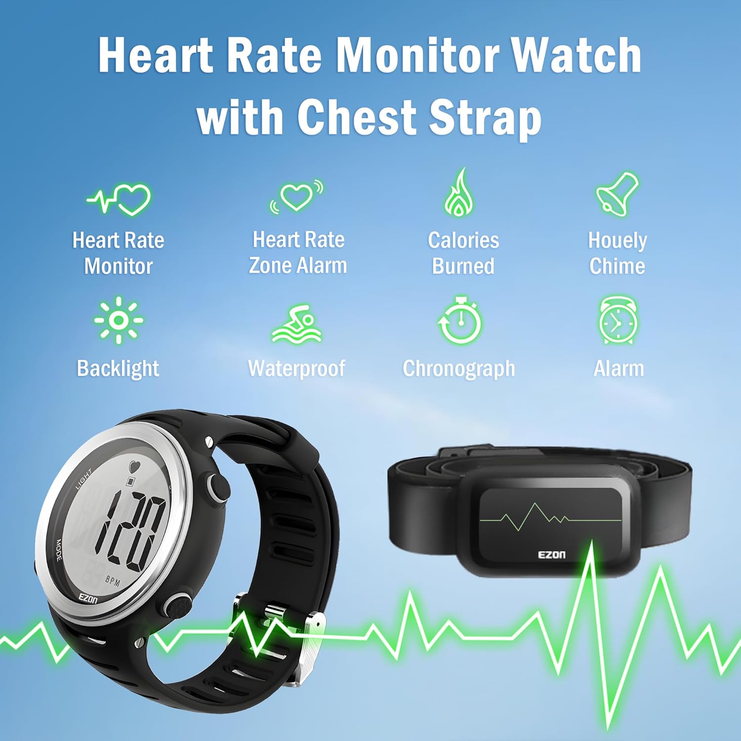 EZON Heart Rate Monitor and Chest Strap, Exercise Heart Rate Monitor, Sports Watch with HRM, Waterproof, Stopwatch, Hourly Chime T007