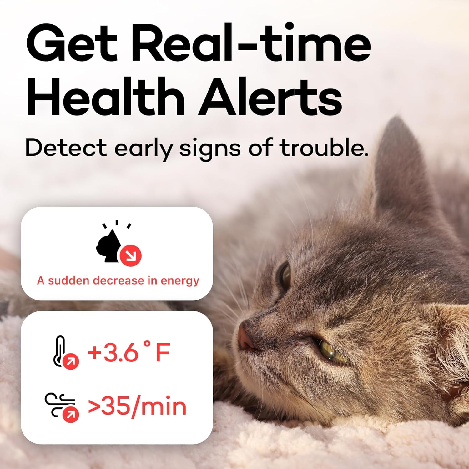 🚨 HEALTH ALERT – Get alerts when significant changes in your cat’s behavioral data are detected. Notice signs of illness in your cat earlier before they become real issues.