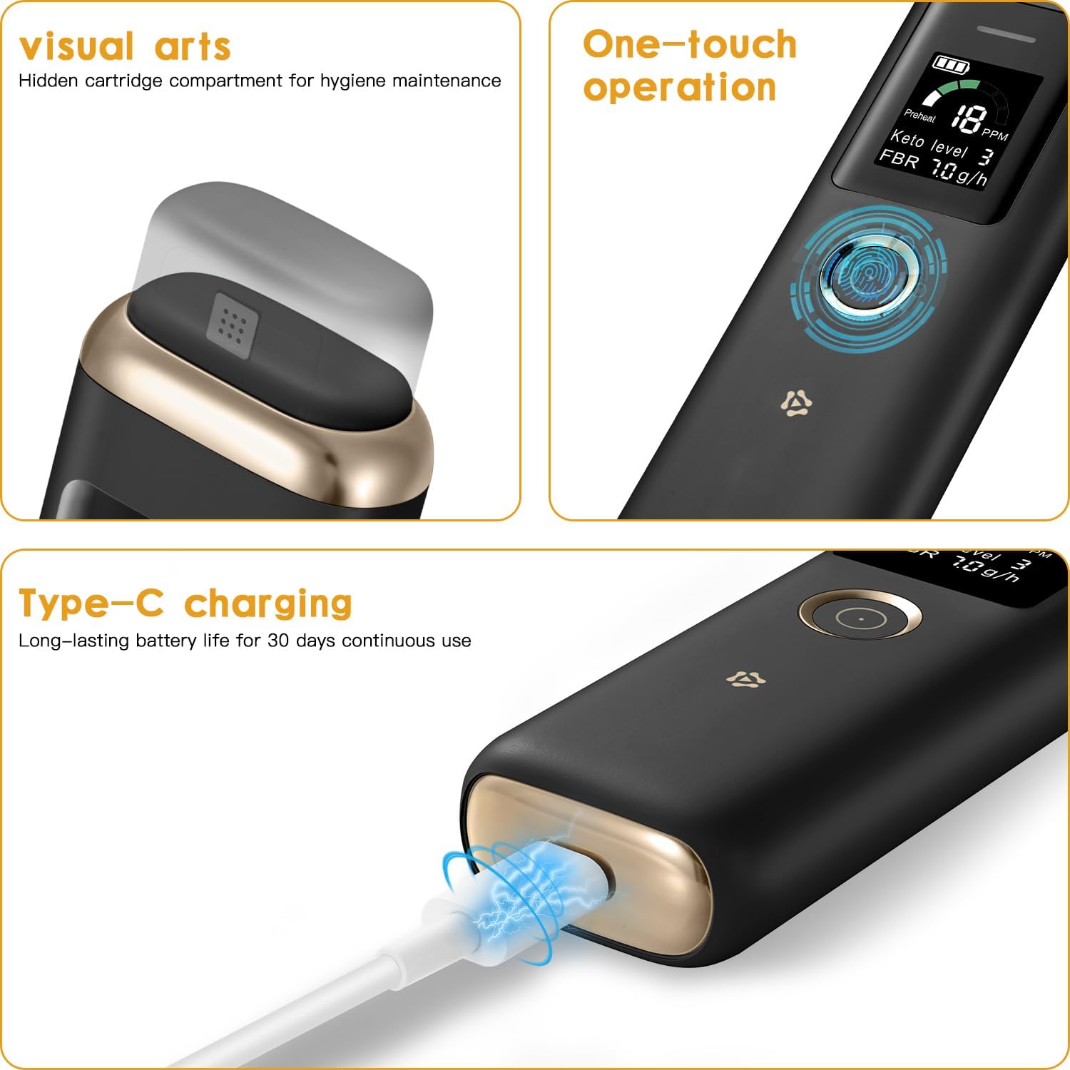 Precision Ketosis Monitoring; Experience precise and reliable results with our ketone breath analyzer. Powered by a 32-bit high-performance integrated chip, it performs accurate calculations of acetone levels, helping you understand your fat-burning rate and optimize your fitness goals.