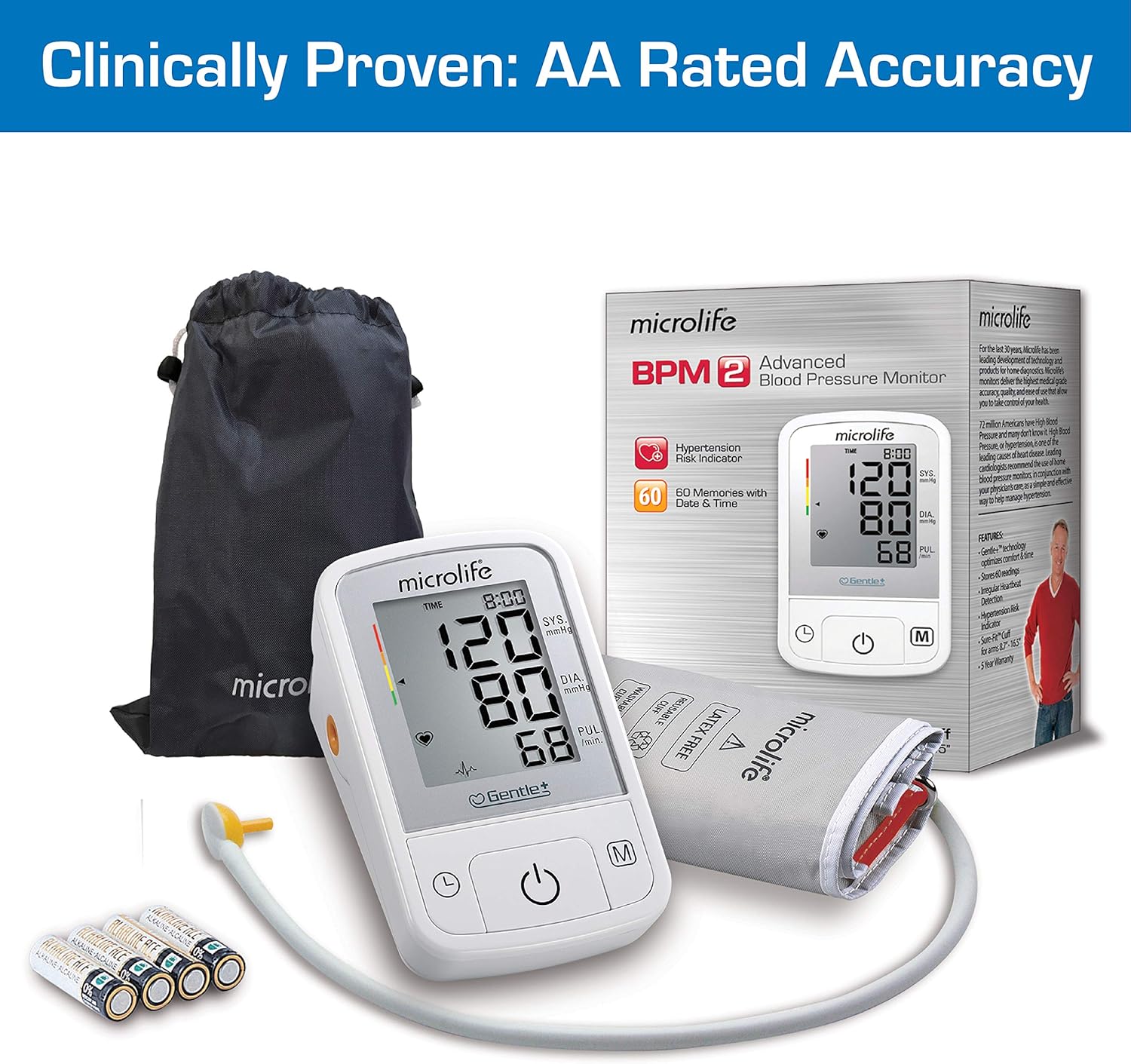 Includes: Blood Pressure Monitor, Upper Arm Cuff, Storage Bag, x4 AA Batteries, and User Manual (English / Spanish). Compatible with the Microlife AC Adapter (sold separately)