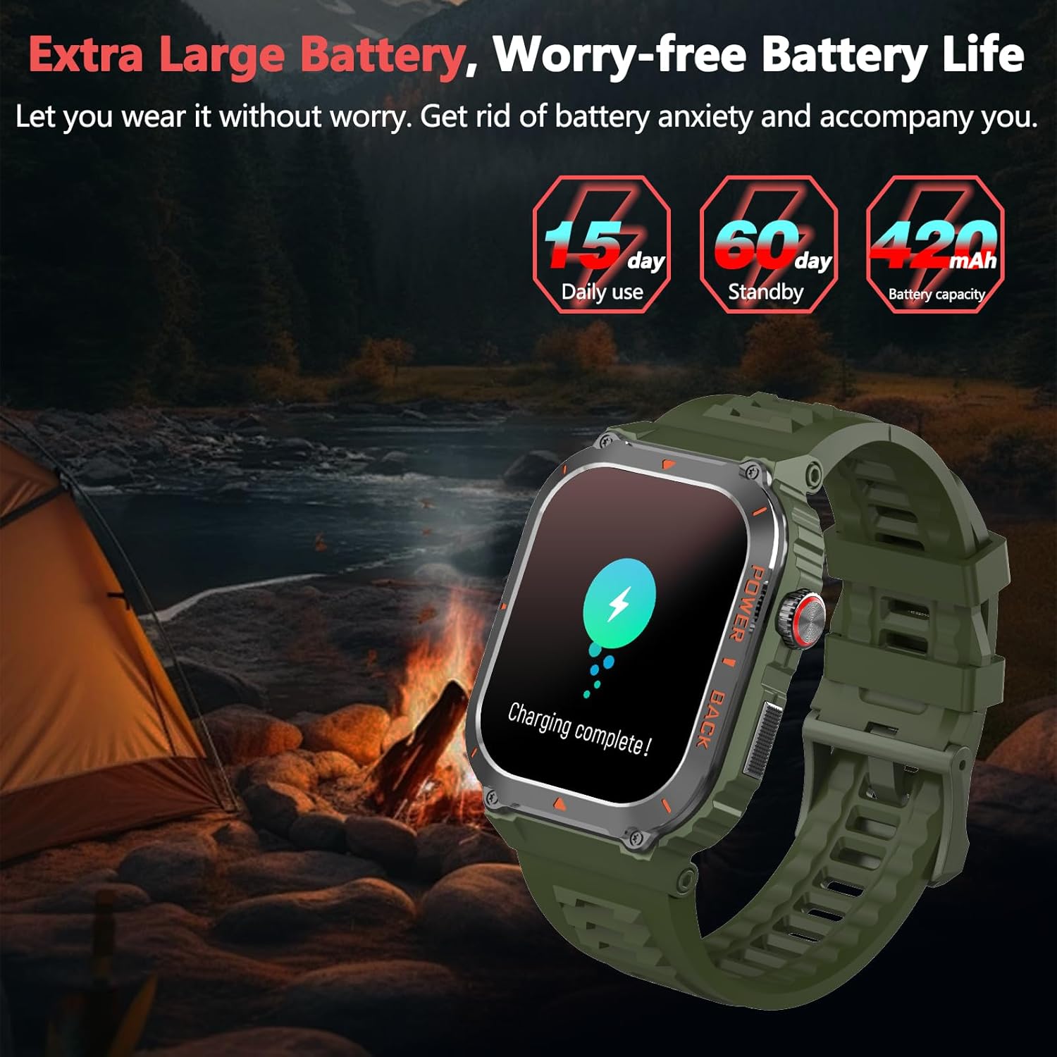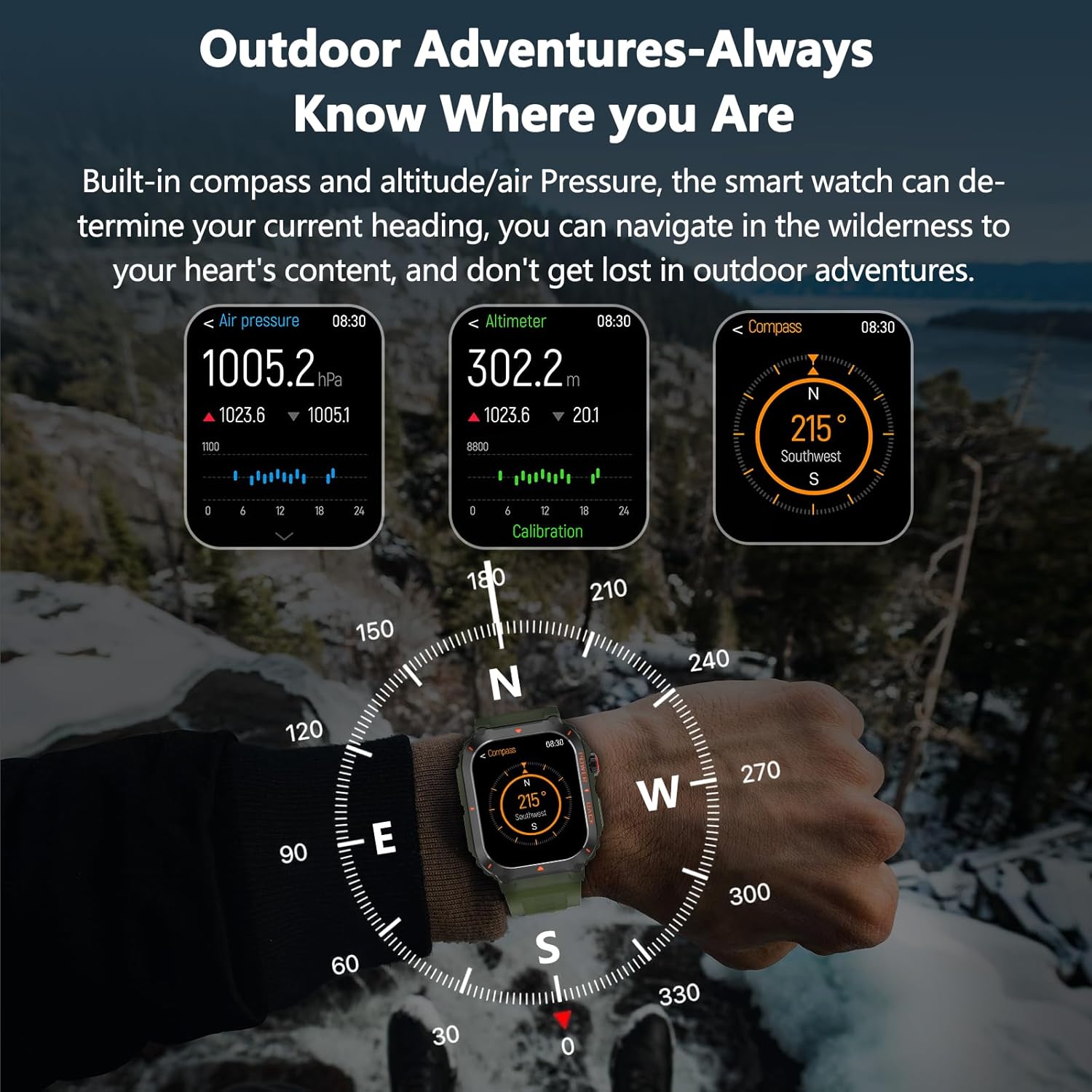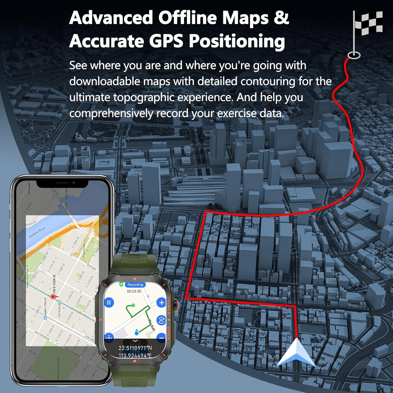 【Rugged and Durable Design】 Built with military-grade durability, this smart watch is waterproof and perfect for outdoor activities. Its robust features, including advanced GPS technology and offline maps, compass, altitude, and air pressure sensors, make it an ideal companion for sports enthusiasts and adventurers alike.