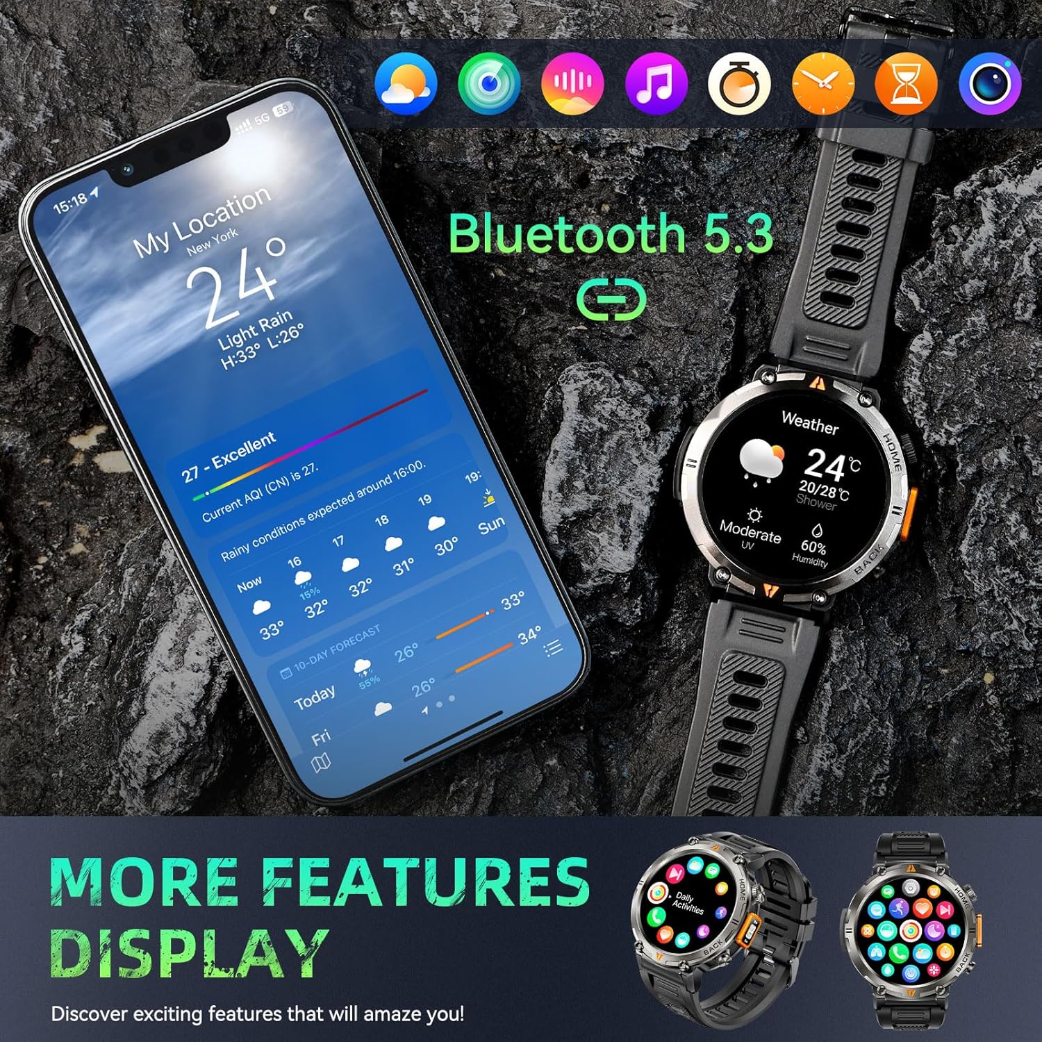 【Rugged Military Smart Watch】- LaNikar tactical smart watch for men features a military-grade metal casing, 9H high hardness screen, and a fully enclosed 3ATM waterproof design. It has successfully passed a variety of military tests, such as shock resistance, dustproof, waterproof, etc. It can easily cope with any harsh environment. You can wear it for swimming, diving, surfing, and other daily water sports! LaNikar rugged smartwatch is the best companion for outdoor activities and adventures.