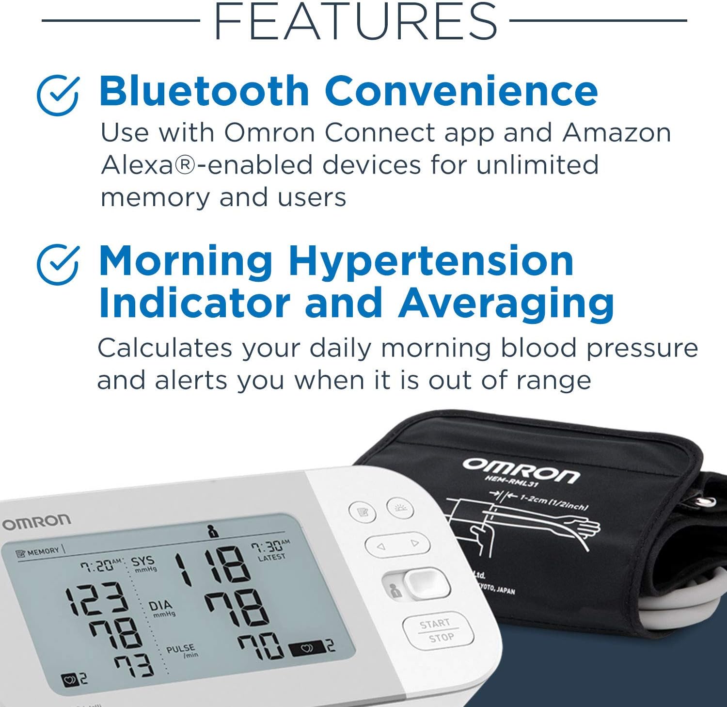 WIRELESS BLUETOOTH CONVENIENCE: Syncs with the free OMRON connect app to track trends, save unlimited readings, and easily share data with your doctor