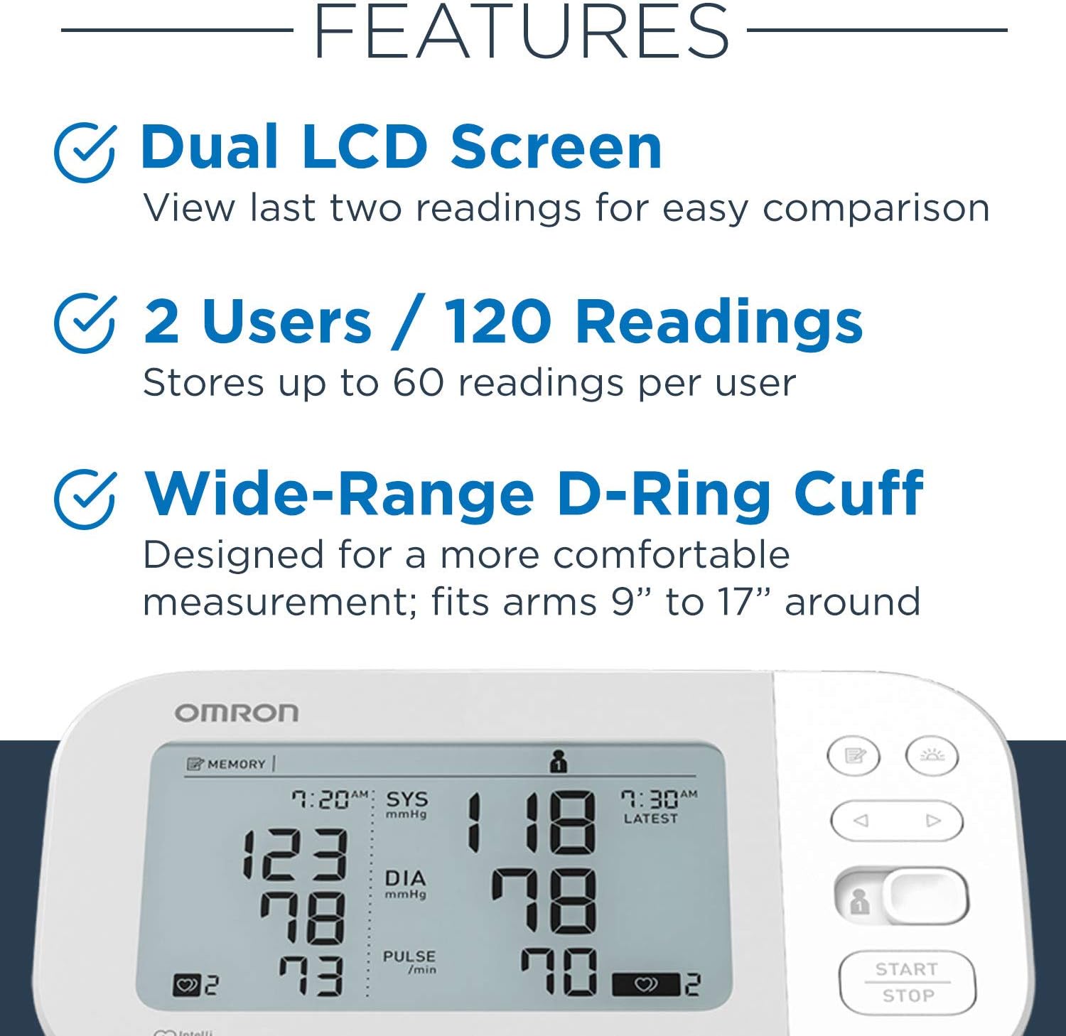 DUAL DISPLAY: The OMRON Gold monitor features a dual-display, last reading comparison, and easy screen navigation
