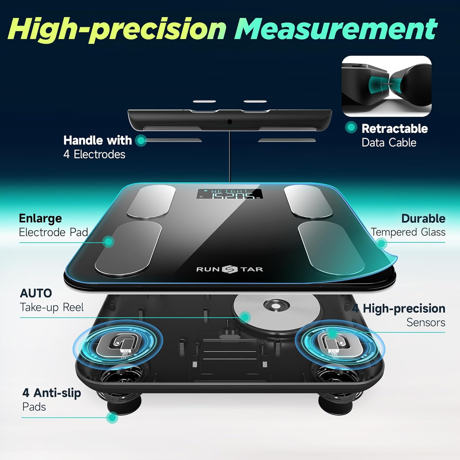 True Segmented Measurement: Runstar scale has a total of 8 electrode pads on the retractable handle and weighing surface, which measures the upper and lower limbs and trunk via Dual Frequency BIA segmented measurement to obtain the most realistic body composition data. You can get a printable body analysis reports in the Starfit APP