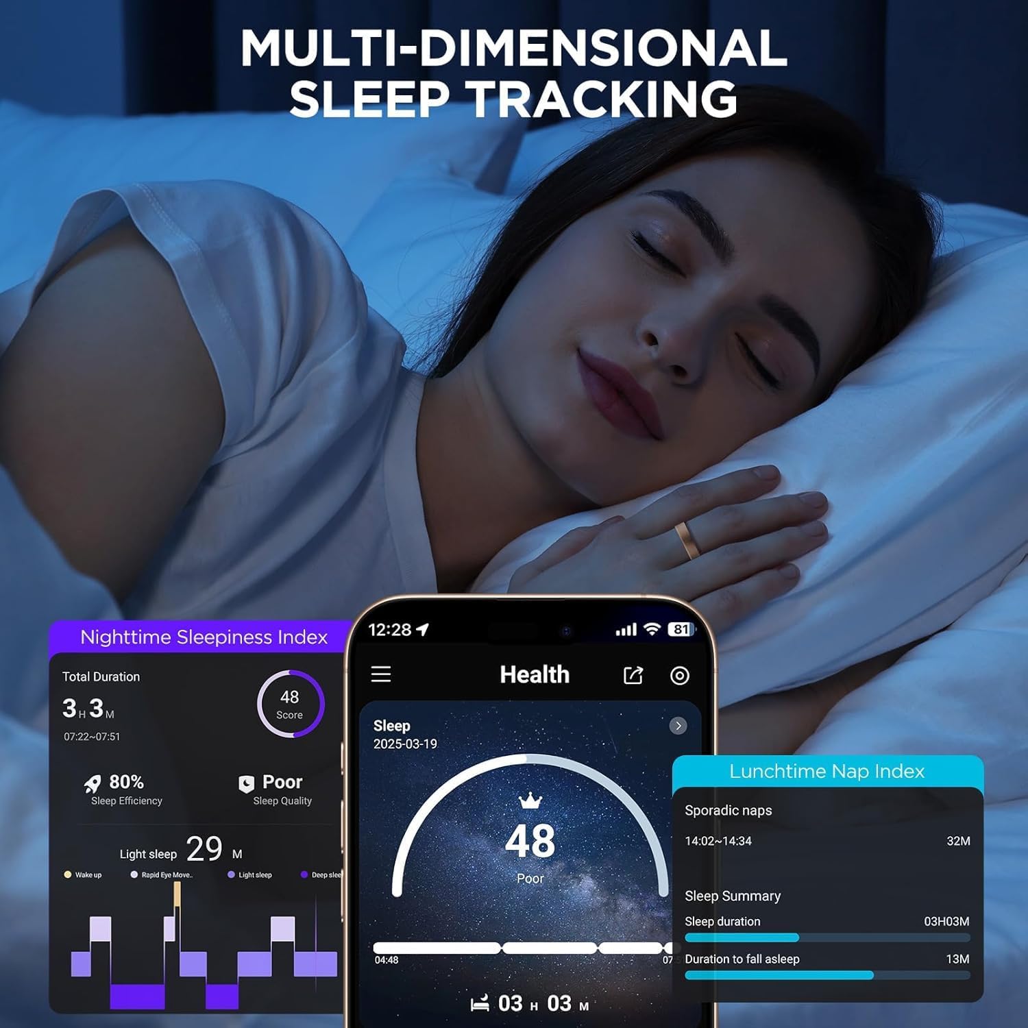 Excellent Sleep Monitoring: This sleep tracker ring can automatically monitor your sleep (include night sleep and naps). Monitor the bedtime, wake-up time, eye movement time, sleep quality (deep sleep and light sleep). You can view detail sleep data in the app to help you better adjust your habits and improve sleep quality.